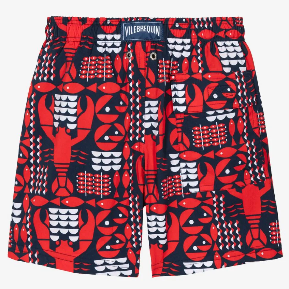 Navy blue and red swim shorts for teen boys by luxury swimwear brand Vilebrequin. Cool and quirky, they are patterned with characterful lobsters in bright red and white. With a faux drawstring, the waist is elasticated for comfort and signed with a logo label on the back. Silky-smooth and with a lightweight lining, they have three pockets for his poolside essentials. These swim shorts contain recycled materials.
