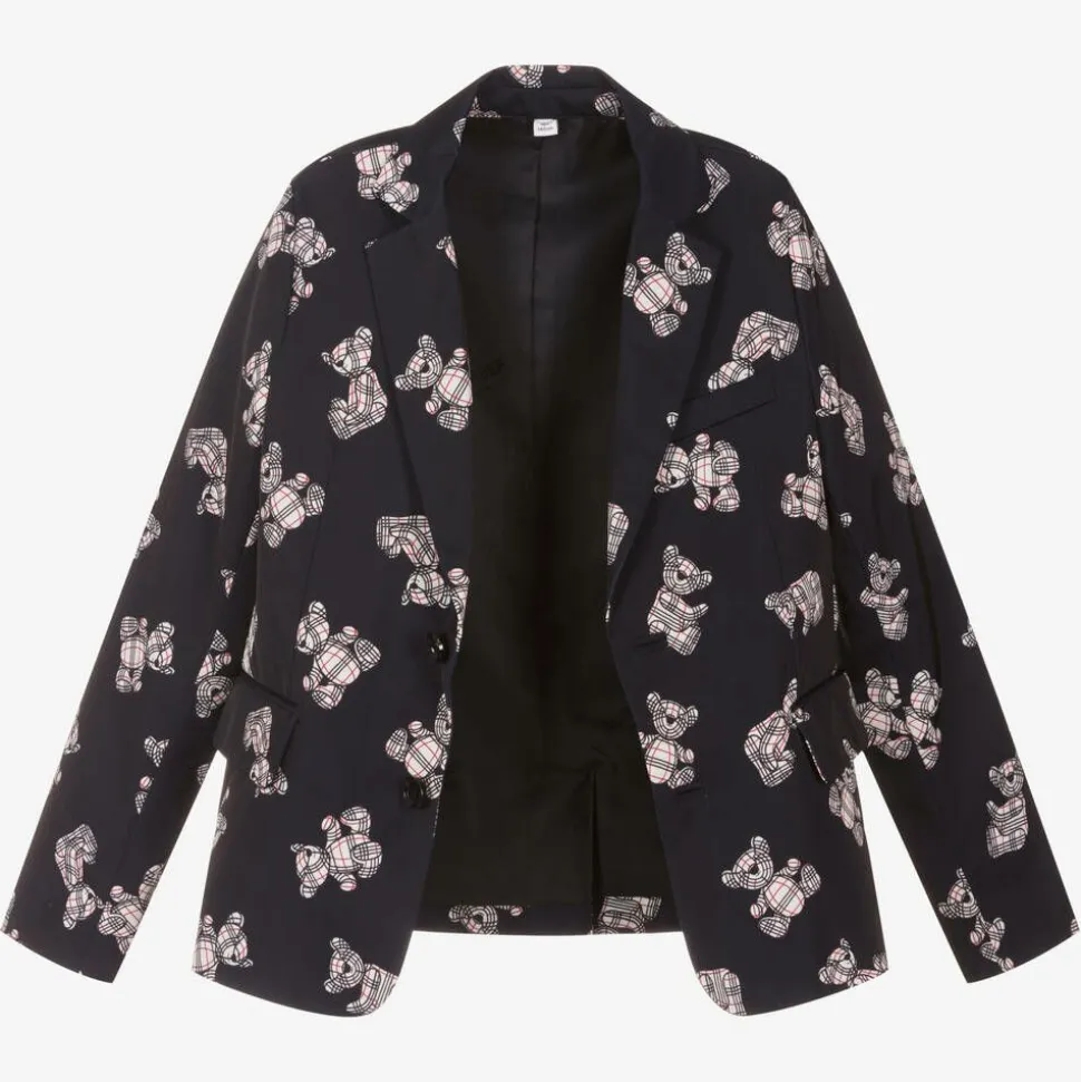Midnight blue blazer for teen boys from British brand Burberry, patterned all over with the designer's Thomas Bear in red, white and blue for statement style. This smart tailored jacket is made from mid-weight polyester twill with a luxurious feel and is lined in satin with a logo jacquard weave. Single breasted with a vent on the back, it has a chest pocket, front flap pockets and useful interior pockets.