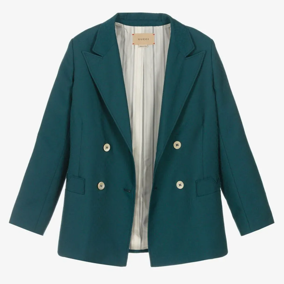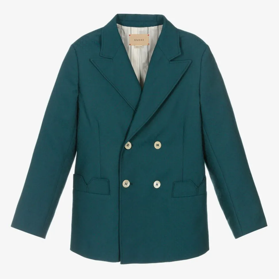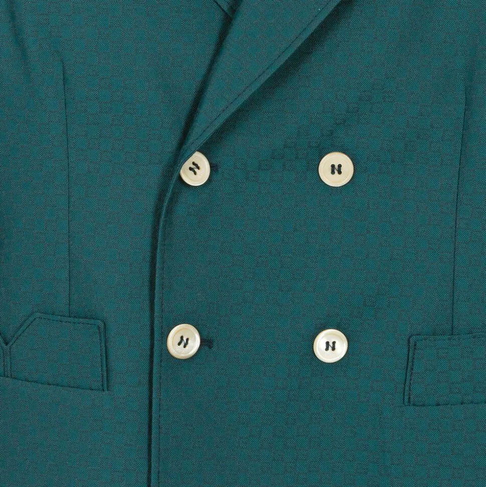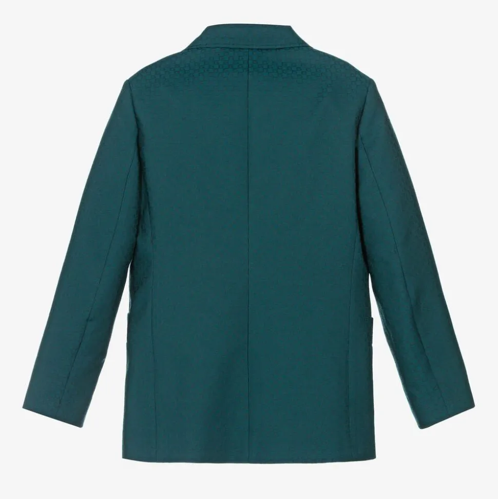 Smart and stylish, this teal blue blazer for teen boys by luxury Italian brand Gucci is patterned in the designer's geometric Square G logo for a distinctive look. In an archival 70's-inspired style, this double-breasted blazer has shaped pockets and fastens with logo buttons for a discreet designer finish. Woven in the finest wool blend, it has a silky smooth lining for additional comfort.