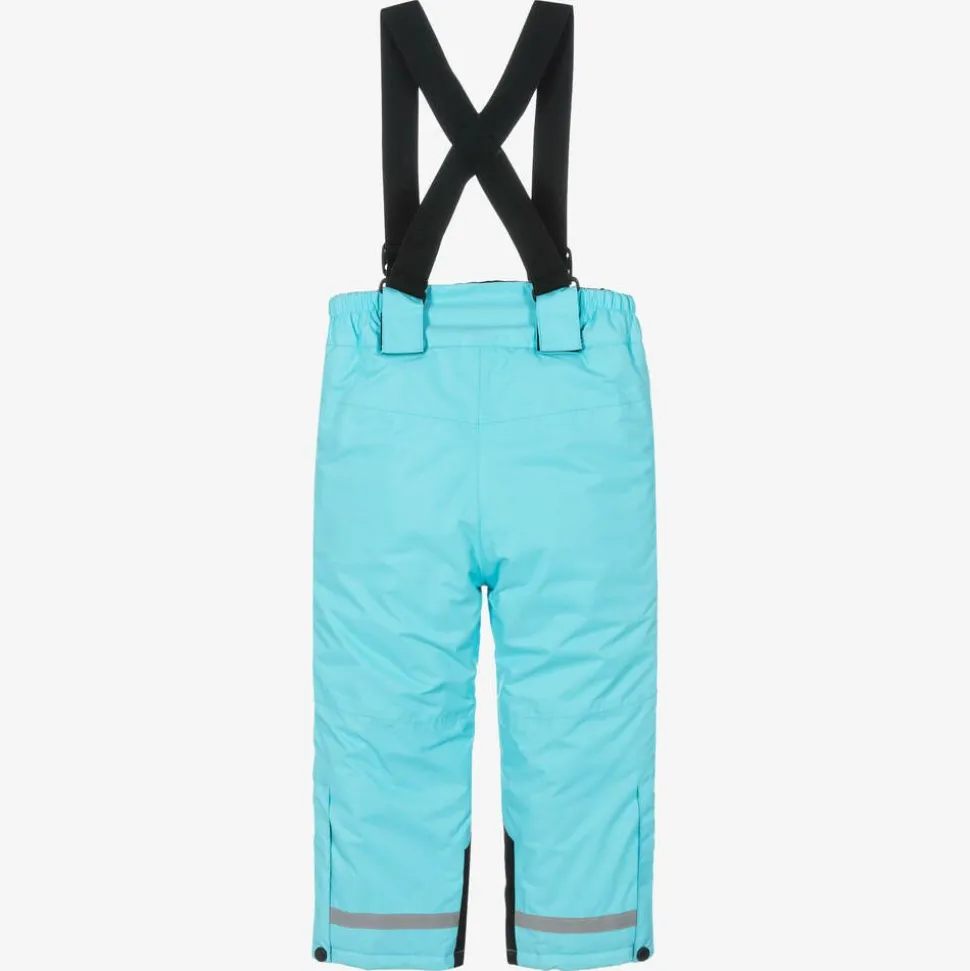 Turquoise blue salopettes for boys and girls by Playshoes, with removable and adjustable black elasticated shoulder braces. Lightly padded for optimum warmth without the extra weight, they are also breathable but windproof and waterproof with the taped seams. The waistband and internal gaiters are elasticated to keep snow out and there are cuff zip and popper on the side to help when dressing. There are reflective trims for improved visibility, front zip and popper fastening and two zipped pockets.