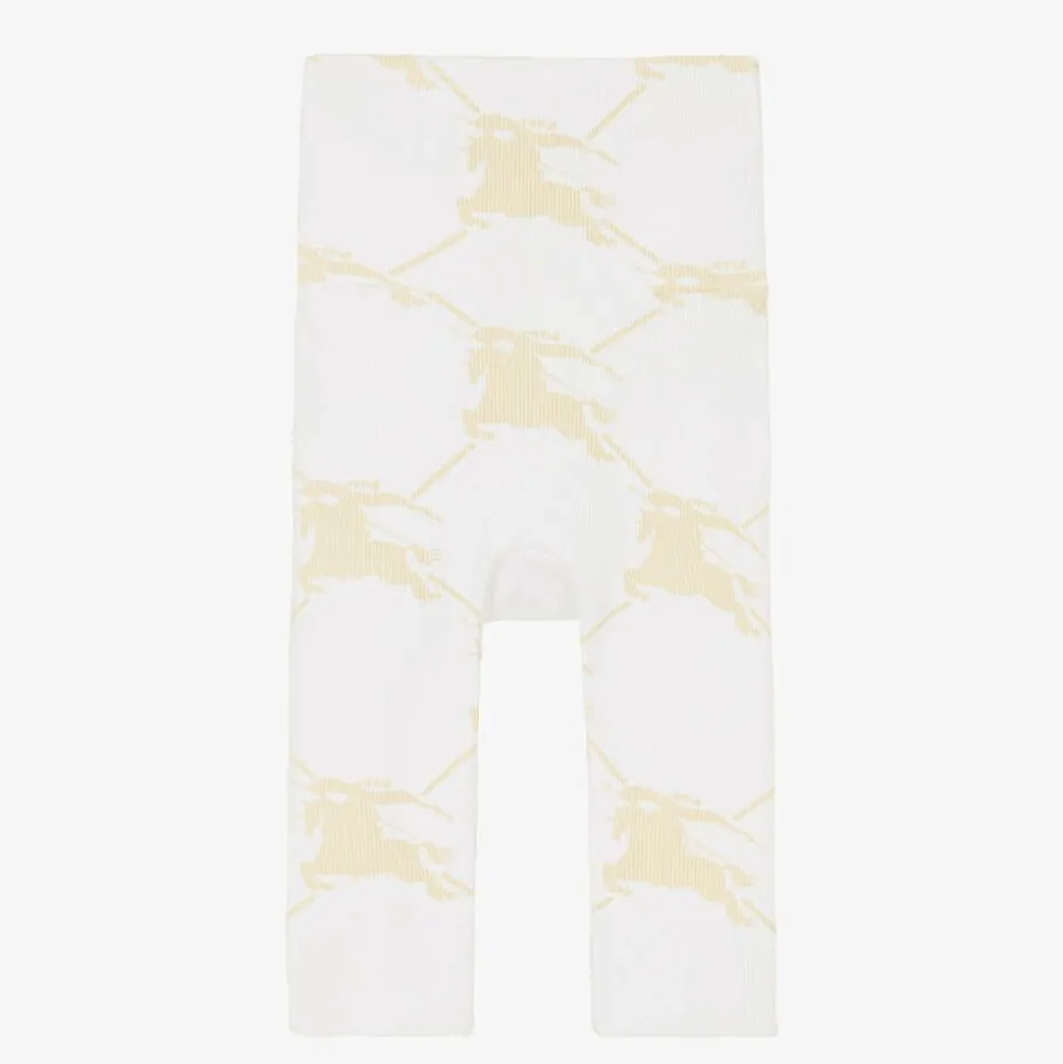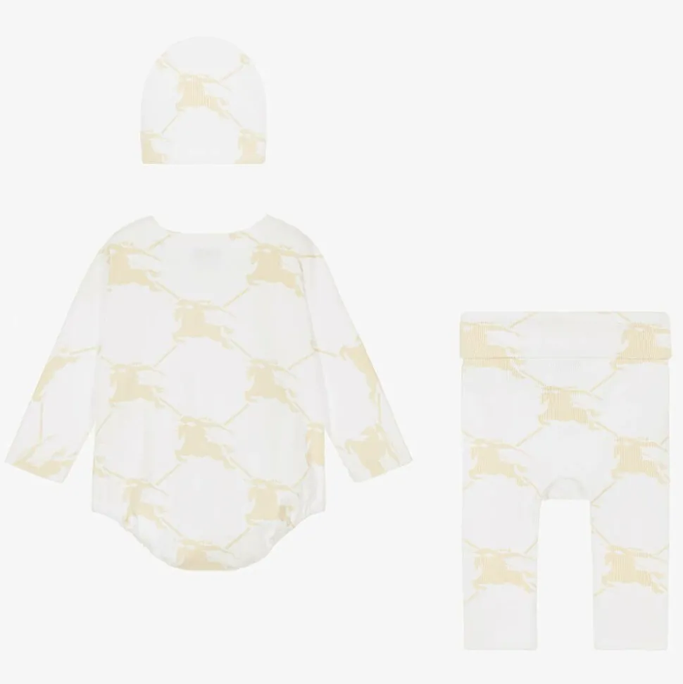 A lovely white and beige babysuit set for boys and girls by luxury brand Burberry, made from finely ribbed cotton jersey. Presented in a charming gift box, the set is patterned with the House's iconic Equestrian Knight Design for a signature designer look. The bodyvest has practical popper fastenings on one shoulder and between the legs, the trousers have a comfortable fold-over waistband, and the hat is fully lined. This product contains organic cotton.