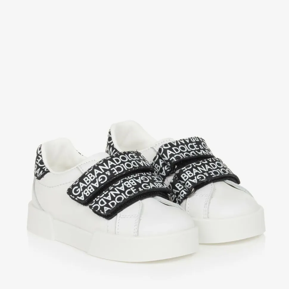 Cool white trainers for baby boys and girls by luxury label Dolce & Gabbana, made from smooth leather. They have black velcro straps and trims printed with a bold white logo pattern for a striking streetwear style. Lined in soft leather with a padded insole, they have non-slip rubber outsoles for good grip.