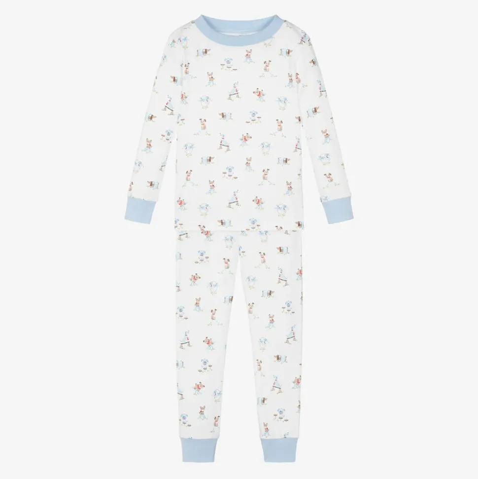 White pyjamas for boys by Kissy Kissy, with a cute print of playing dogs in blue and beige. Made in super soft Pima cotton, they are snug fitting for safety.