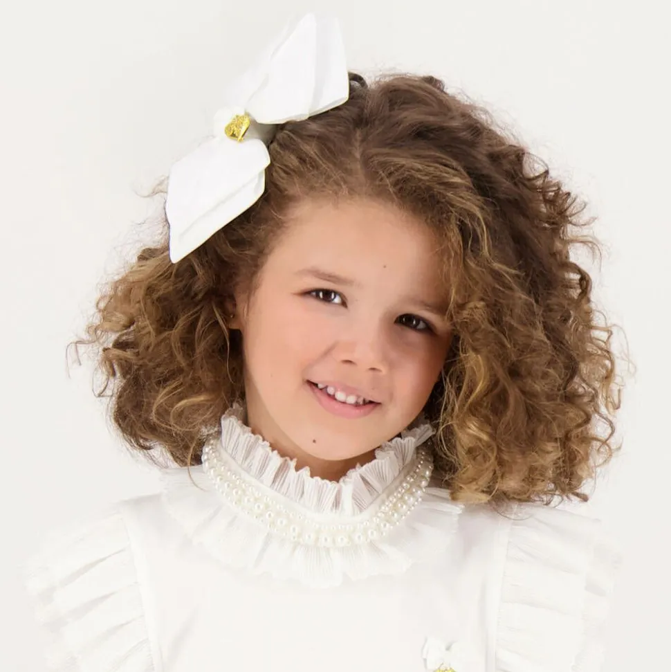 Large off-white grosgrain bow by Angel's Face, enhanced with a golden charm. It has a sturdy metal clip for easy fastening.