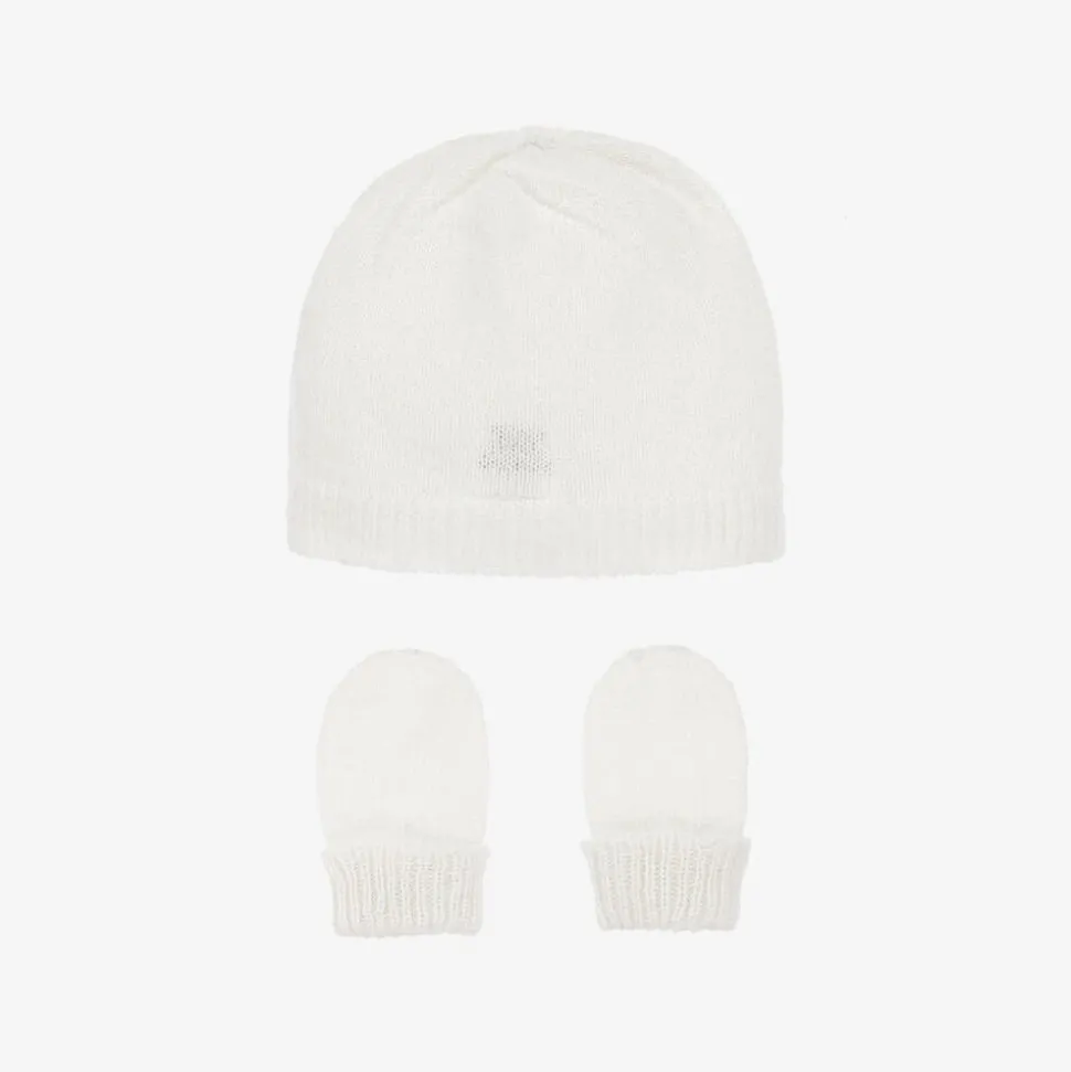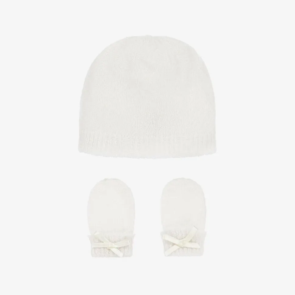 A beautifully soft off-white hat and mittens set for baby boys and girls by G. H. Hurt & Son, made from luxurious cashmere. In a fine knit, the sweet layette hat is finished with a lightly ribbed edge for a comfortable fit. For an adorable look, the matching mittens have folded cuffs, delicately trimmed with tonal satin bows.