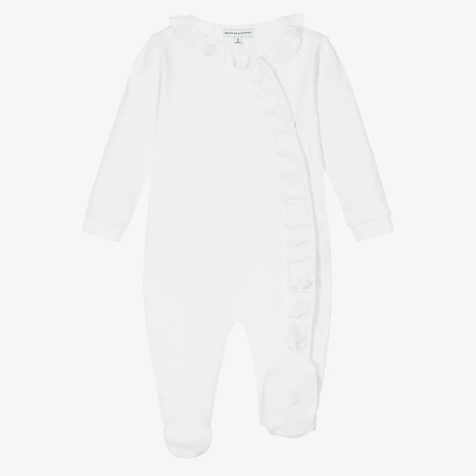 Exclusive to Childrensalon, a white cotton babygrow and bib set for boys and girls by British heritage brand Beatrice & George. The soft, comfortable jersey babygrow has a sweet poplin ruffle around the neckline that extends down one leg. The ruffle covers the popper fastenings, which make dressing and nappy changes quick and easy. It comes with a poplin bib that has a beautiful, hand-embroidered monogram logo on the front, surrounded with flowers. It is fully lined and fastens with a popper around the back.