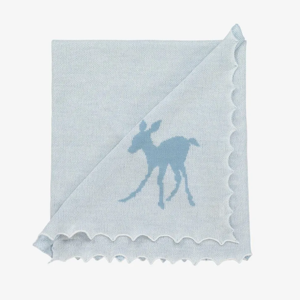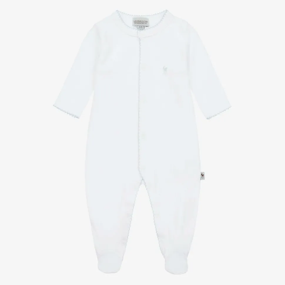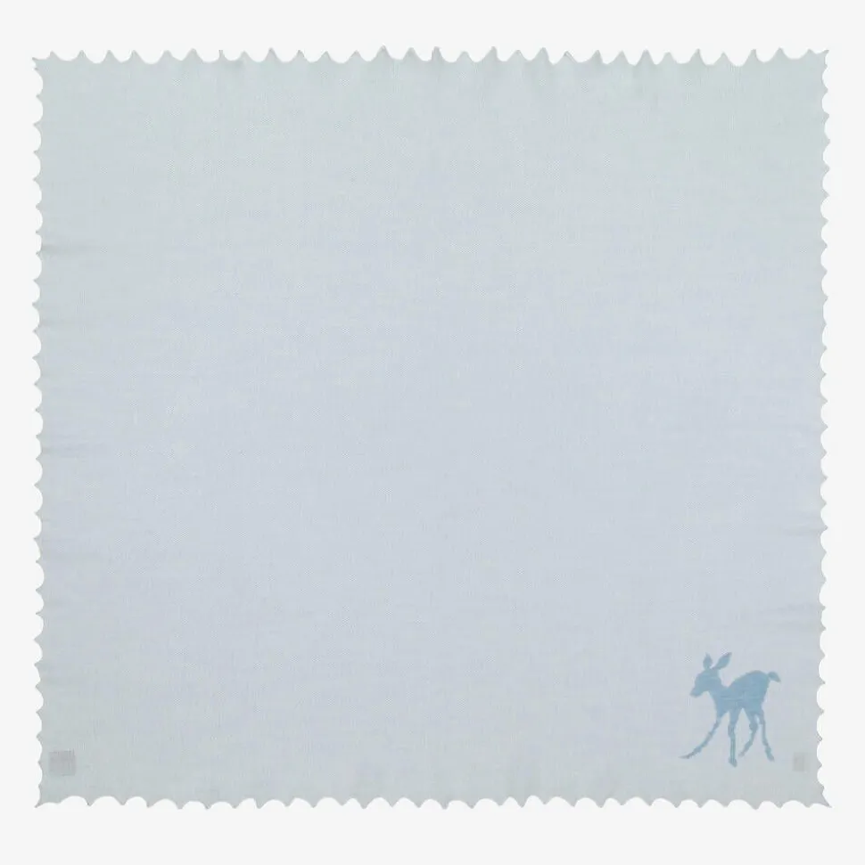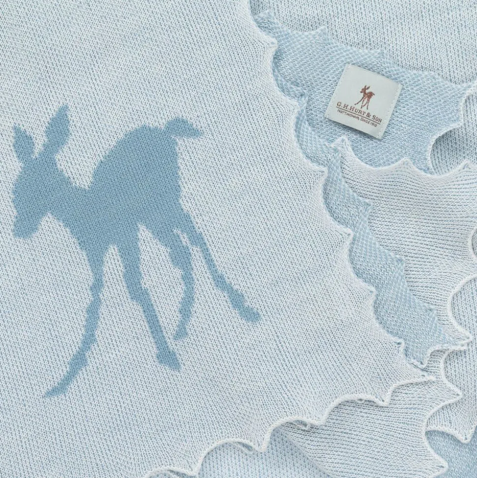 A white and pale blue gift set for baby boys and girls by G.H.Hurt & Son, presented in a lovely gift box. Beautifully handcrafted by artisans, the gorgeous wool shawl has elegantly hand finished scalloped edges and a knitted Fawn motif, iconic to the brand. Made from a soft cotton-blend jersey, the adorable babygrow has a subtle embroidered trim and branded detailing printed on the chest. It fastens with poppers on the front and between the legs for easy dressing.