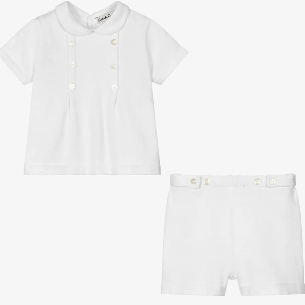 Smart white top and shorts set for little boys by Sarah Louise, knitted in soft cotton. The top has a rounded collar and pleats on the front with decorative buttons. The shorts have an elasticated waistband and decorative buttons on the front.
