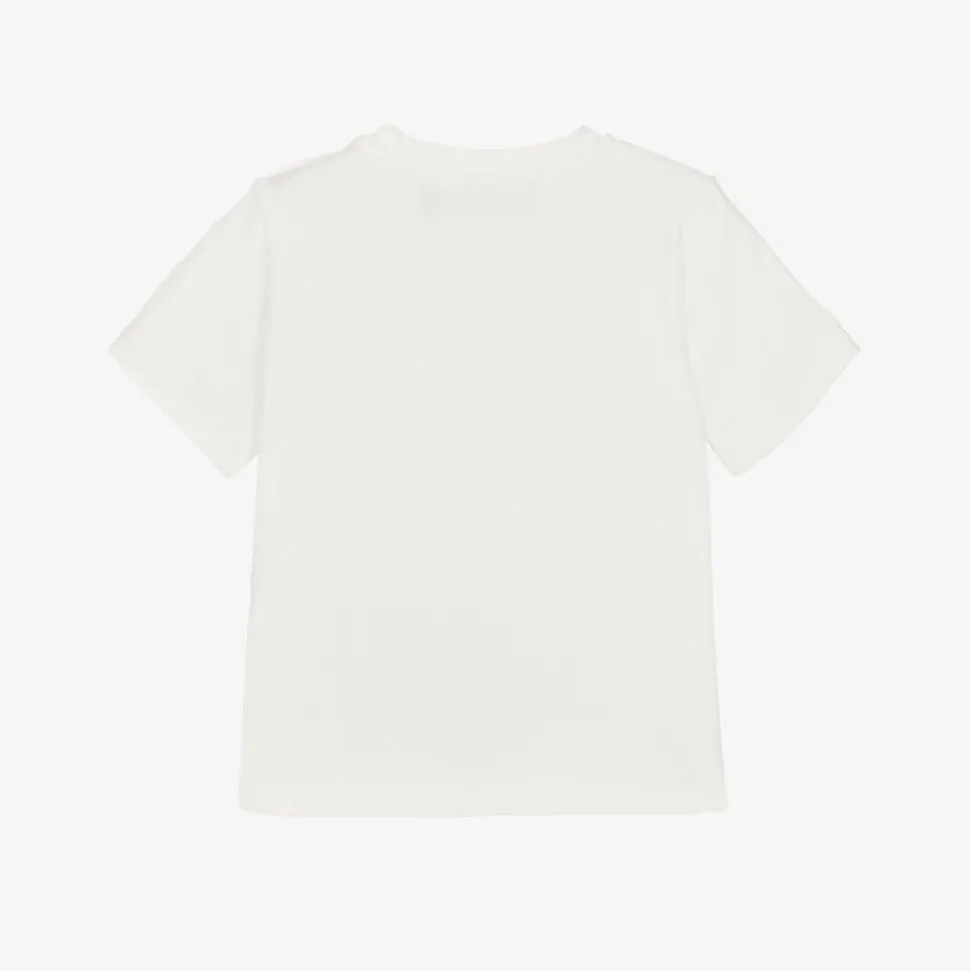 A white cotton T-shirt for baby boys and girls by luxury fashion house Versace, made in soft cotton jersey, with a slight stretch for comfort. Inspired by the adult collection, this casual piece features a distinctive, slightly textured logo motif on the front in brown leopard print. It is styled with short sleeves and a lightly ribbed crew neckline, with shiny gold, logo-embossed poppers on one shoulder to help with dressing and add an extra branded touch.