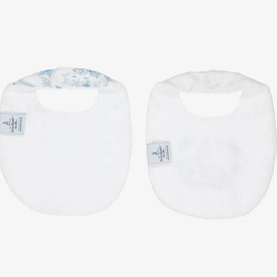 Super cute pack of two bibs for baby boys and girls from Peter Rabbitâ„¢ by Childrensalon, featuring original illustrations from Beatrix Potter's magical tales in pale blue. Made in a lightweight linen and cotton blend, one bib is embroidered, and the other printed, with the famous little rabbit and flowers. They both fasten with a popper around the back and have an absorbent cotton towelling lining.