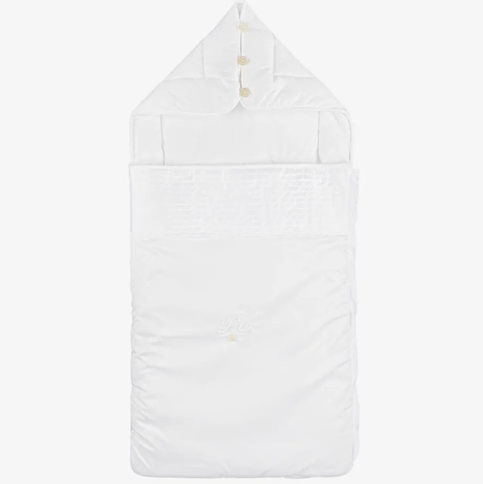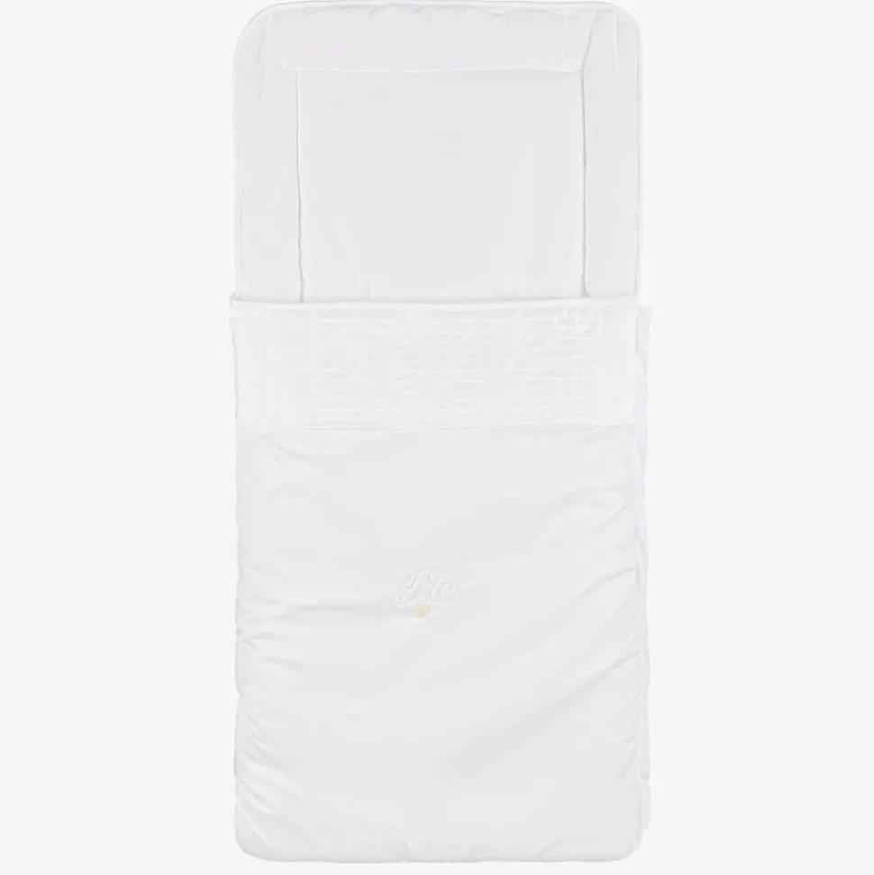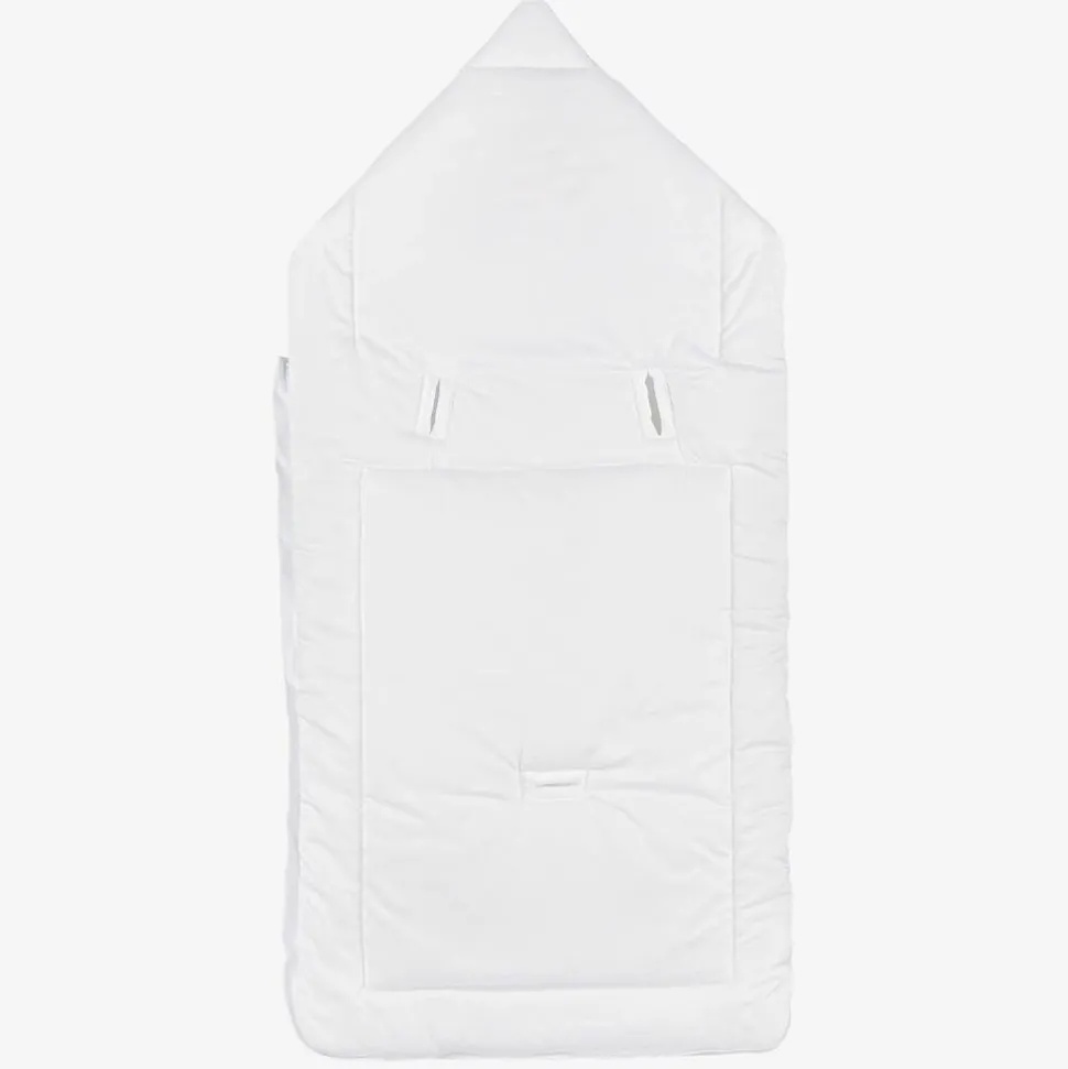 Beautiful white baby nest for boys and girls by Tartine et Chocolat. It is made in soft cotton, with pleats across the front, a large embroidered logo and a sweet mother-of-pearl logo star charm. The mother-of-pearl buttons on the hood can be opened to form a flat surface and the three slits on the back can be used to secure the nest to a car seat or buggy.