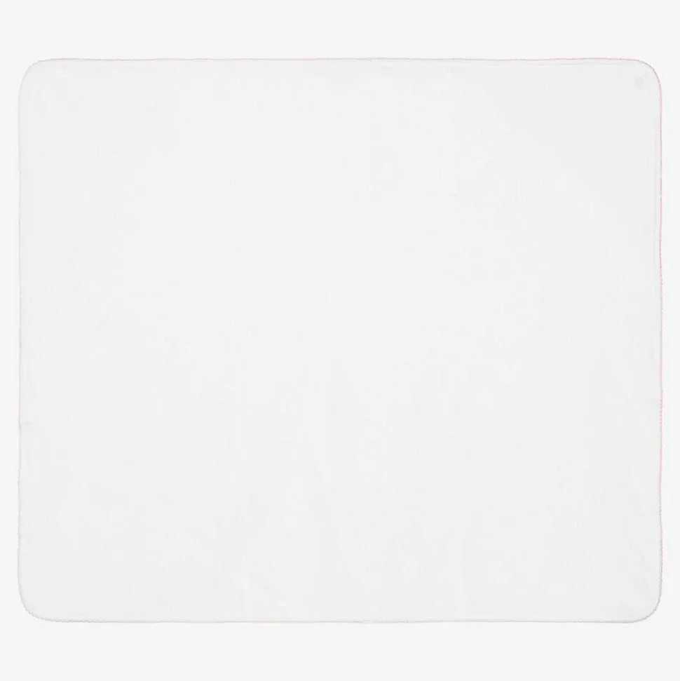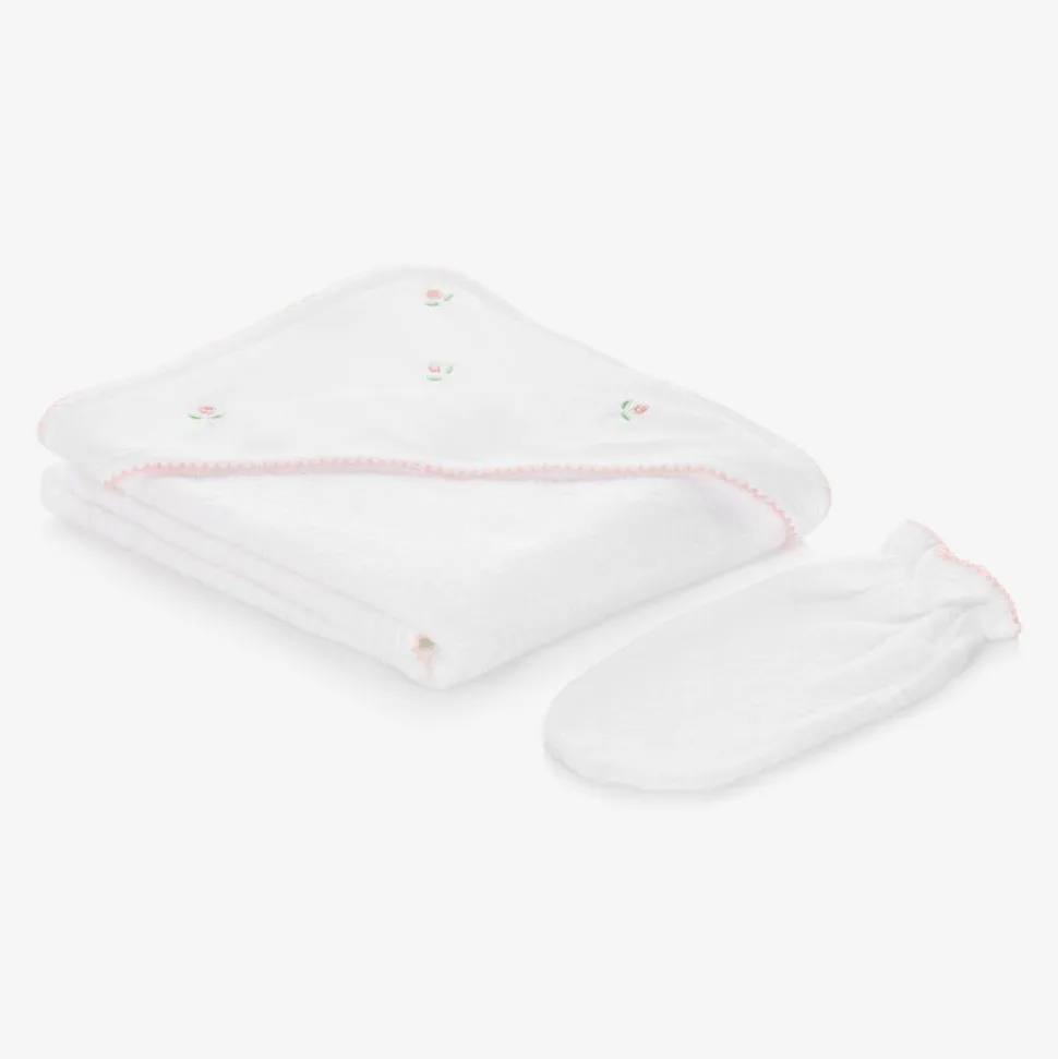 Baby girls white terry cotton hooded towel and wash mitt set from Kissy Kissy. Beautifully soft and fluffy, the Pima cotton hood is patterned with pretty embroidered roses.