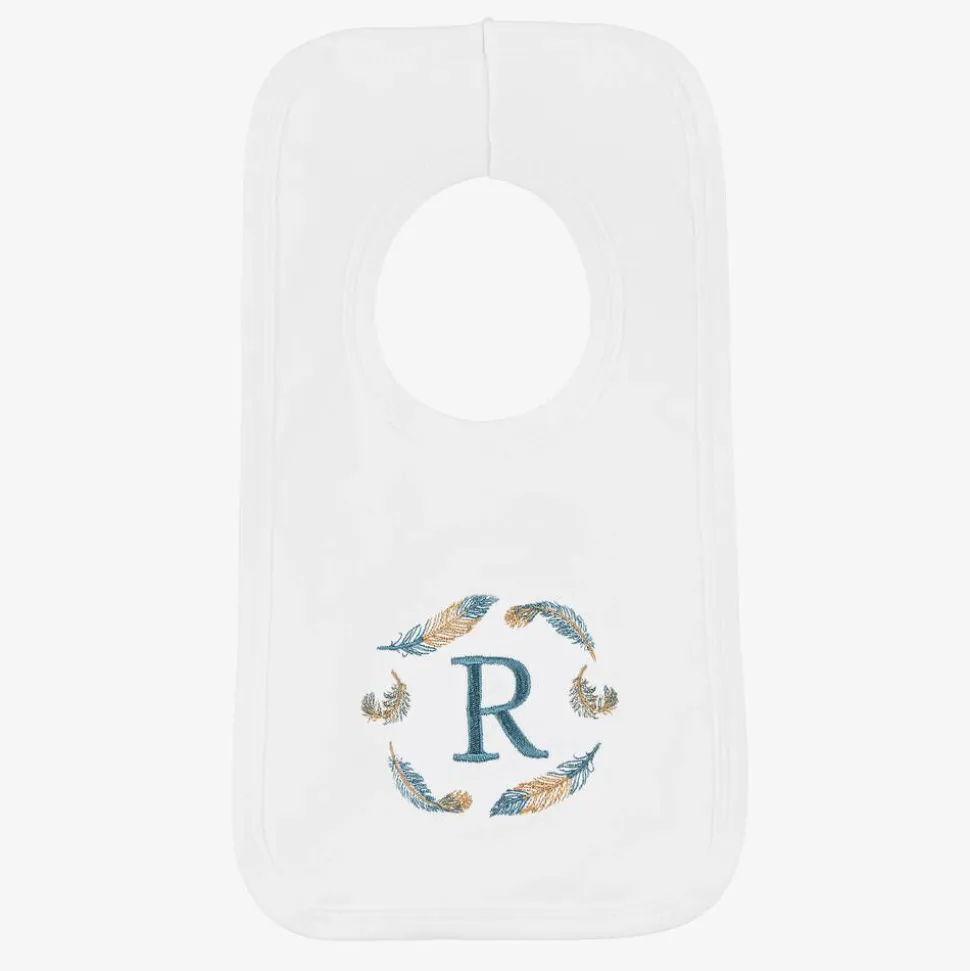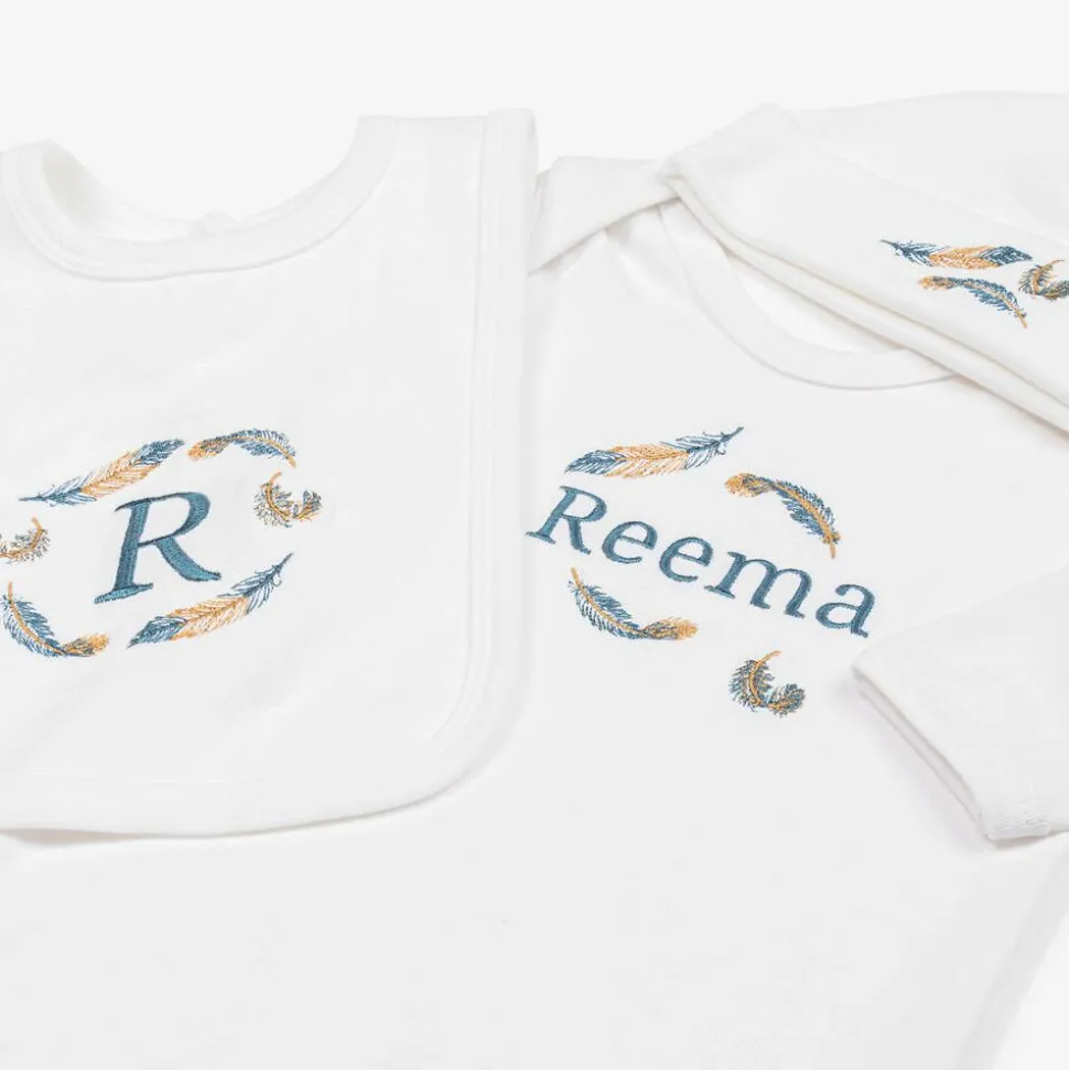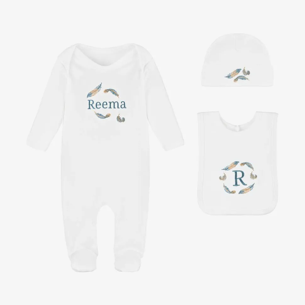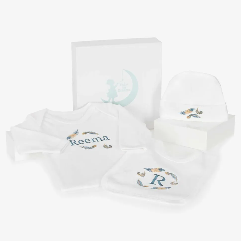 White cotton babysuit gift set for little boys and girls by Paint My Dreams, exclusive to Childrensalon. Lovely as a thoughtful gift for a special new arrival, each of the pieces are delicately embroidered with your child's name, initial and sweet feathers. The babygrow has a wide, envelope neckline to help with dressing and useful poppers between the legs. The dribble bib fastens with a popper on the back of the neck. An adorable layette hat completes the lovely set, which is beautifully presented in a branded gift box.