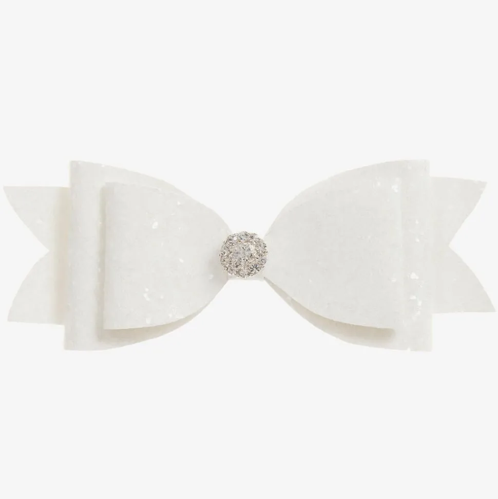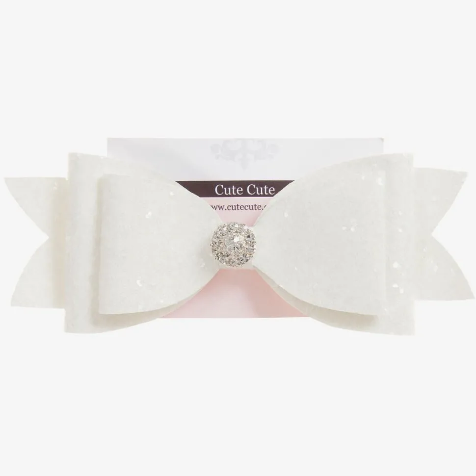 A lovely handmade hairclip by Cute Cute. Perfect for dressing up an outfit, this hair clip has glitter and diamante bow details.
