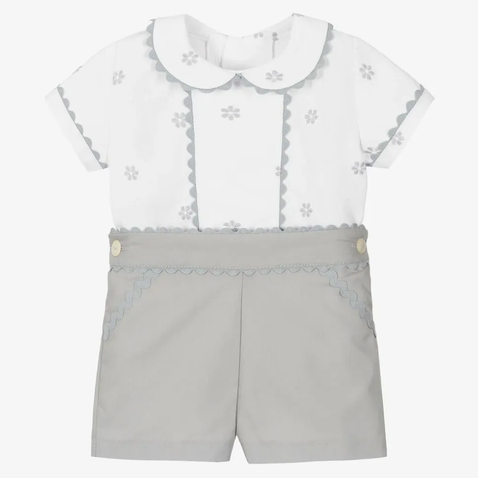 Traditionally styled for baby boys and girls, a classic shorts set by Ancar, made in a soft cotton blend. The white shirt has grey embroidery detailing, a Peter Pan collar and sweet grey rick-rack trims. The lightweight grey shorts have matching trims and the waistband is elasticated at the back for a comfortable fit. Both pieces button together, for a neat and tidy look.