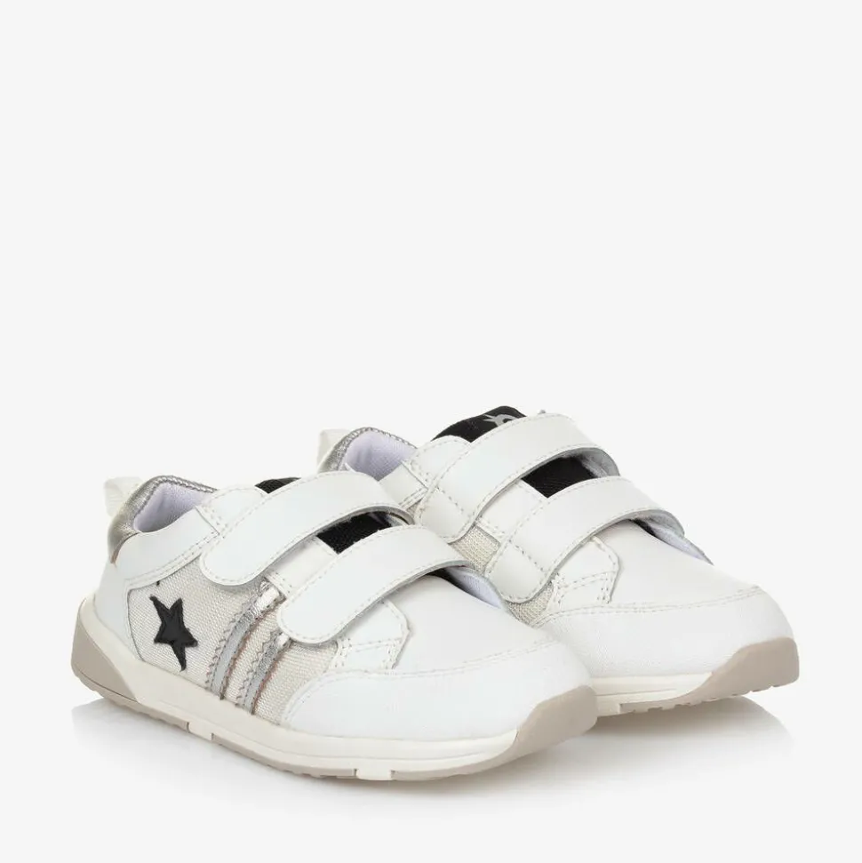 Sport-inspired white trainers for boys and girls by Old Soles, made with supple leather and breathable mesh uppers. Black and silver trims add a stylish touch and they have two velcro-fastening straps for an adjustable fit. They are comfortably lined in soft, breathable mesh and have removable cushioned insoles that are breathable, absorbent and antibacterial. The flexible non-slip rubber soles are ridged for good grip.