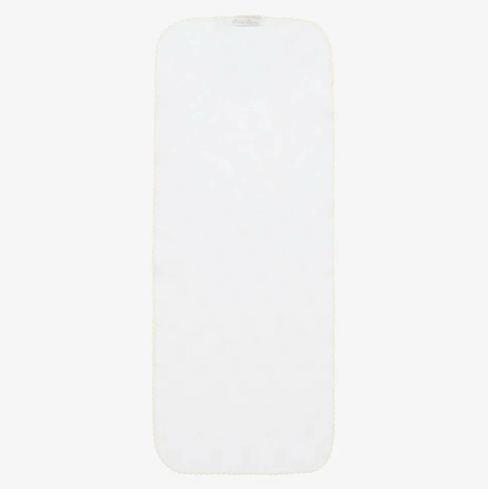 A white burp cloth for baby boys and girls by Kissy Kissy, patterned with little yellow ducklings. This useful feeding accessory is made in soft Pima cotton jersey and lined in absorbent towelling. It has a delicate picot trim and can be placed over your shoulder when burping baby.