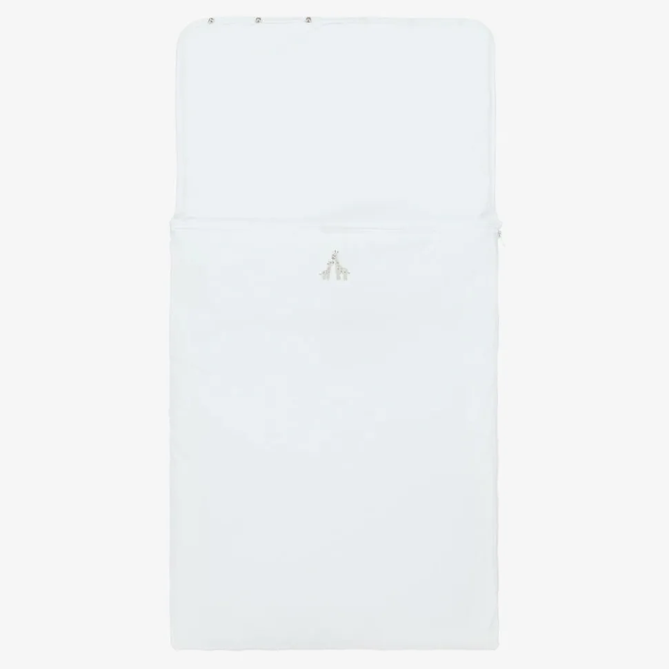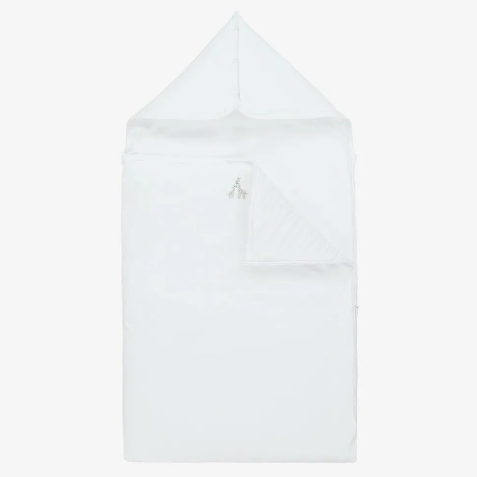 Exclusive to Childrensalon, a white nest for baby boys and girls by Kissy Kissy, made in super soft Pima cotton jersey. Lightly padded for warmth, this cosy nest has cute grey hand-embroidered giraffes on the front. It has a zip fastening on one side and the popper fastenings on the hood can be opened to lay it flat.