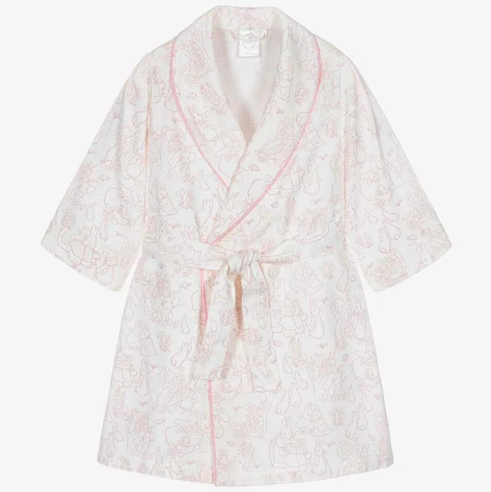 Adorable white and pink dressing gown for girls from Peter Rabbit™ by Childrensalon, printed with charming original illustrations by Beatrix Potter. Ideal for a comfortable night’s sleep, it is made in luxurious cotton twill blended with flame-retardant fibres, free from harmful chemicals and brushed for extra softness. It has an attached sash belt and coordinating pink piped trims.