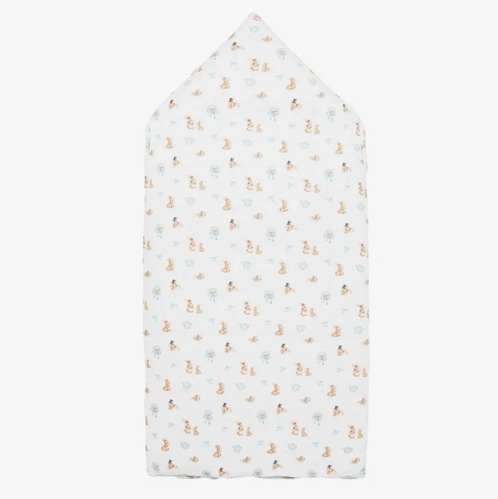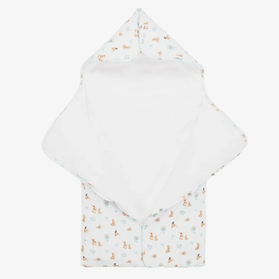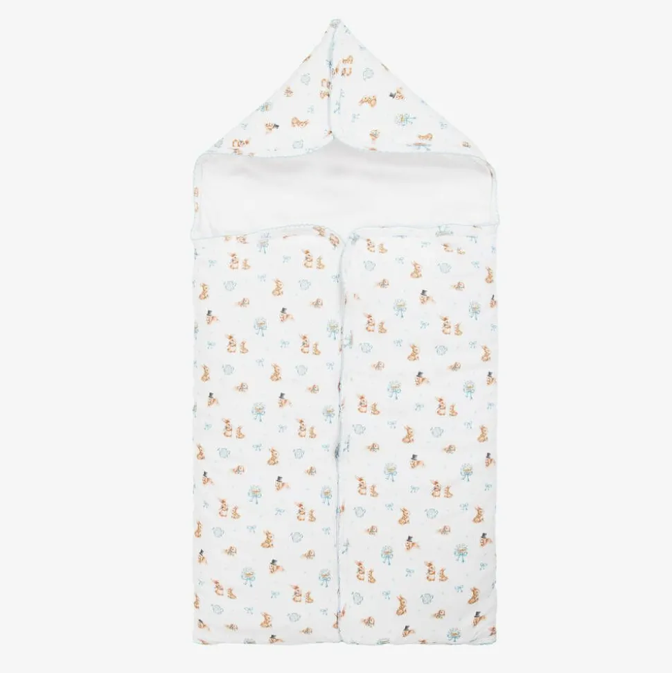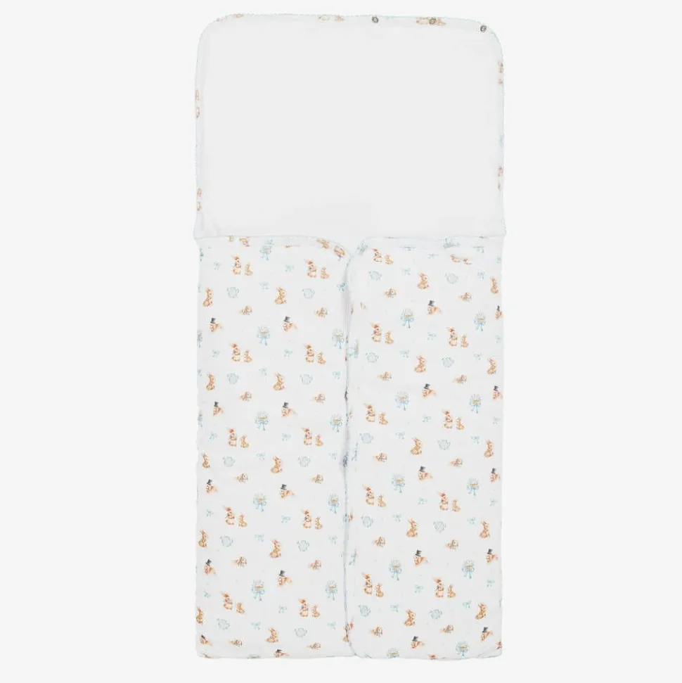 White padded nest for baby boys by My Little Pie, made from beautifully soft organic Supima cotton jersey. Ideal for keeping your little one cosy and warm, it has a sweet bunny rabbit pattern and an embroidered blue picot trim. When unfastened it can be laid flat, providing a comfortable surface for changing or playing.