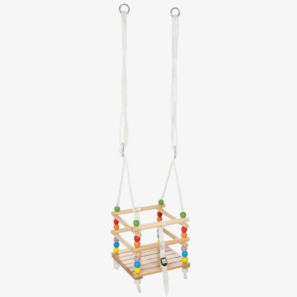 Lovely wooden cradle swing for little boys and girls by Bigjigs, great as an adventurous addition to the garden. Encouraging their love of the outdoors, your child can safely sit in the secured wooden seat, surrounded by brightly coloured beads. Supported by strong, adjustable rope ties, it can be attached to a frame for endless outdoor fun.