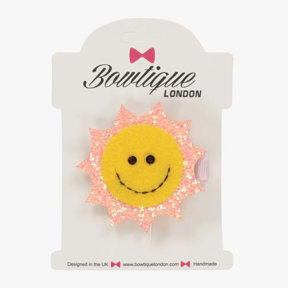 Adorable yellow and pink smiley sun hair clip by Bowtique London. Made in glitter covered soft felt, It has an easy slide-in alligator clip.