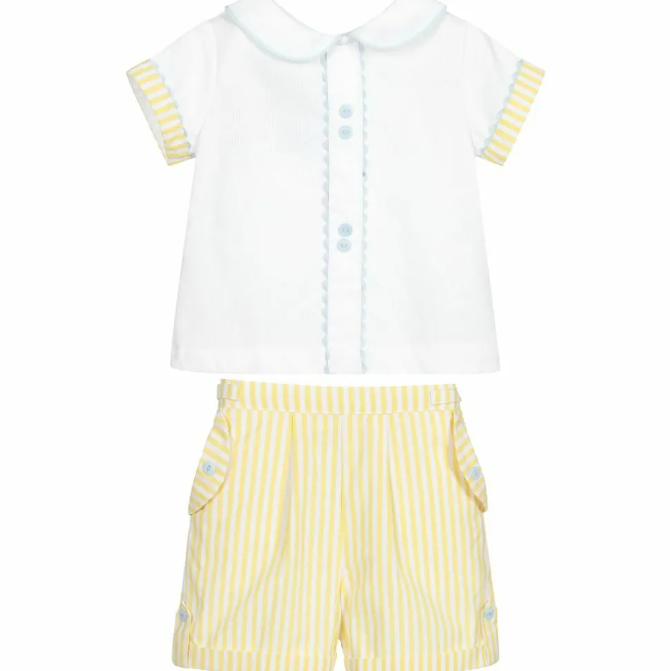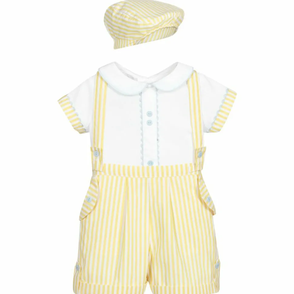 Yellow and white shorts set for baby boys by Beau KiD, made in soft, lightweight cotton. The white shirt has pale blue piping on the collar and blue ric rac and button trims. The yellow and white striped shorts are lined and have removable shoulder straps and front pockets. A matching hat completes the set.