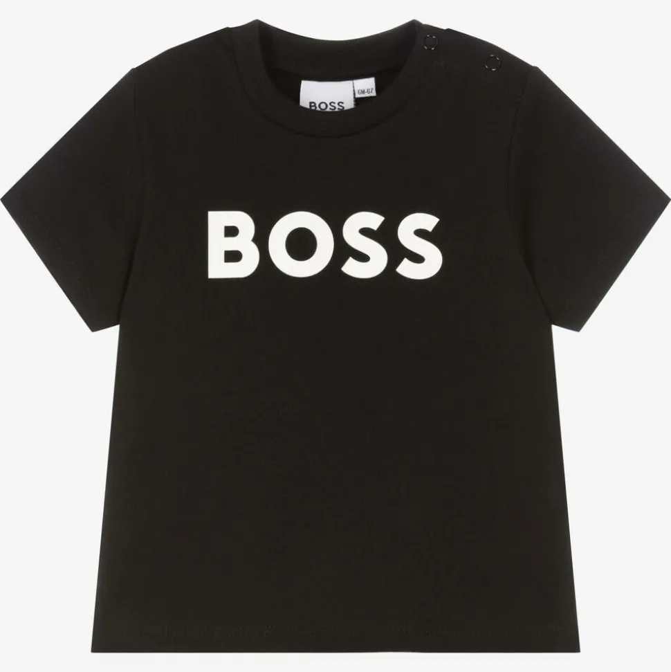 Black T-shirt for baby boys from BOSS, made in soft cotton jersey. This cool and casual wardrobe staple has a large white logo printed on the chest. There are popper fastenings on one shoulder for stress-free dressing.