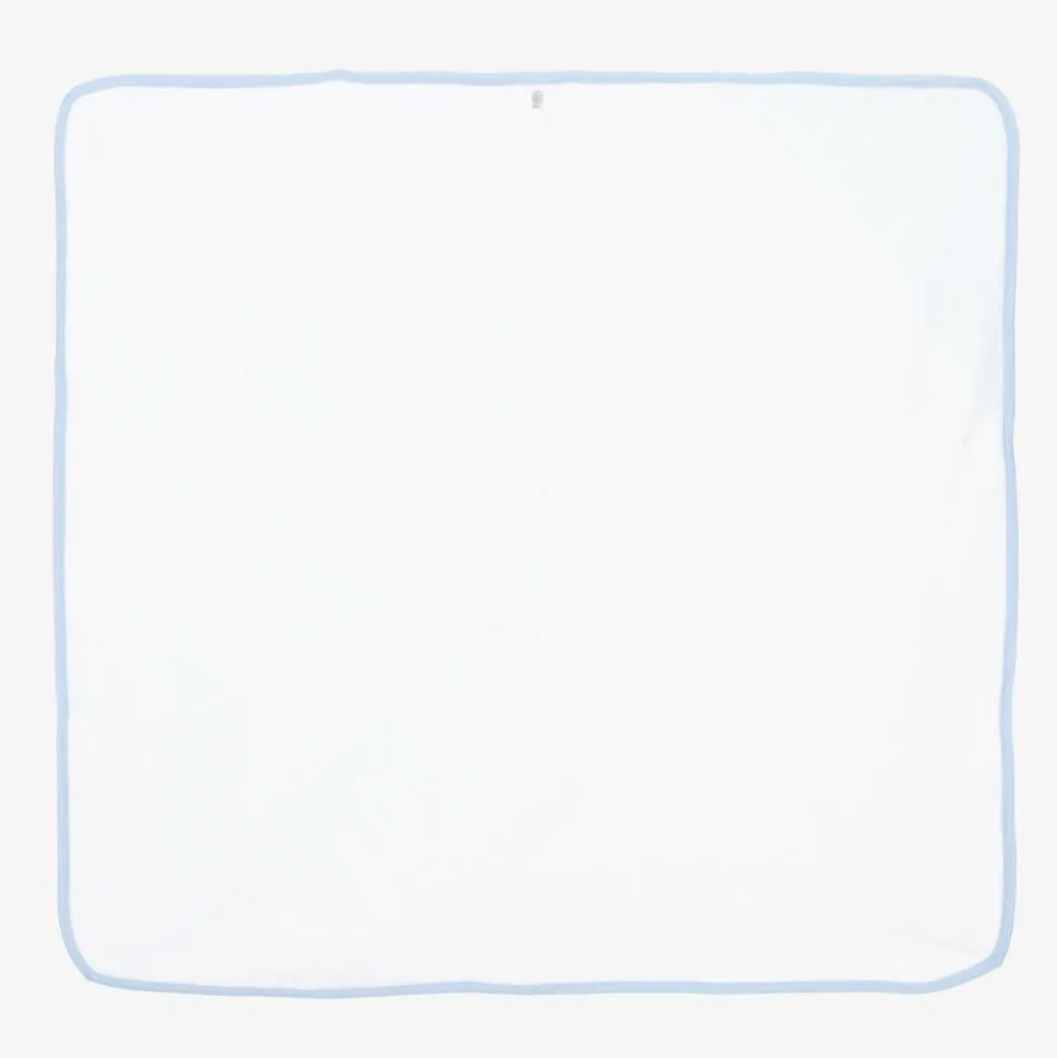 White cotton hooded towel and mitt set for baby boys by Kissy Kissy. Made in beautifully soft towelling, it has a pale blue Pima jersey hood with an embroidered bear face, and matching trims. Ideal for bath time, it comes with a soft mitt that has an elasticated cuff.