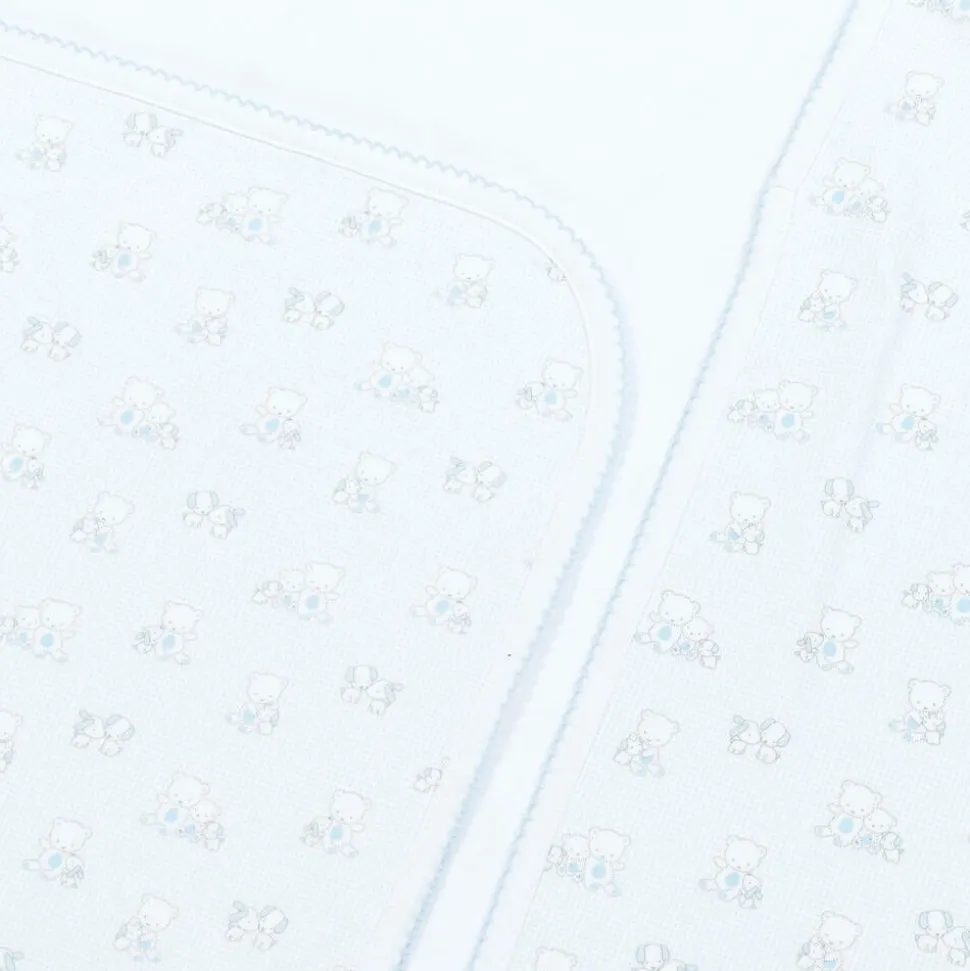 Pale blue blanket for baby boys by Kissy Kissy, patterned in tiny micro-dots with cute teddies and puppies. It is made in super soft Pima cotton jersey, with blue picot embroidery around the edges. Ideal for use in the pram or car seat, it also makes an attractive nursery accessory.