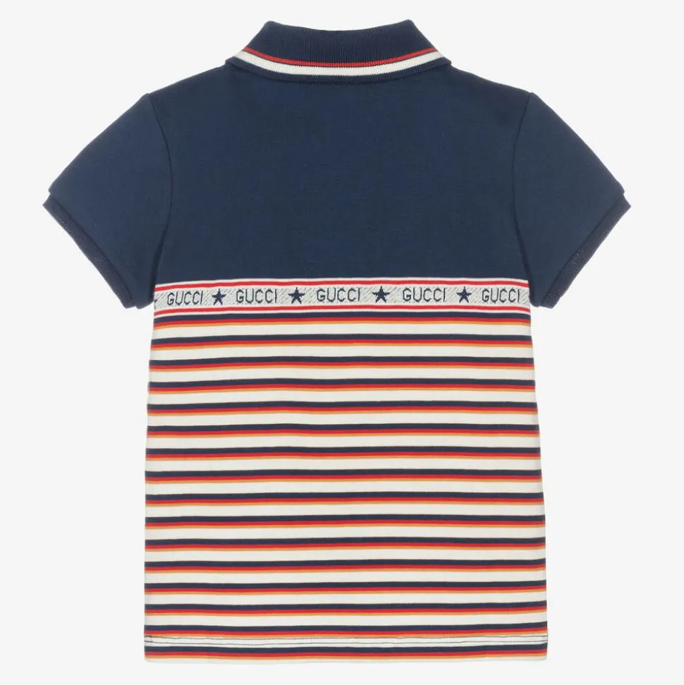 Navy blue polo shirt for baby boys by luxury Italian brand Gucci, made from comfortable cotton jersey. In shades of red, white and mustard yellow, this striped polo has a distinctive Gucci trim on the front and back with a knitted star pattern. A preppy style, the ribbed collar features red and white striped detailing and is framed with branded button fastenings on the front.