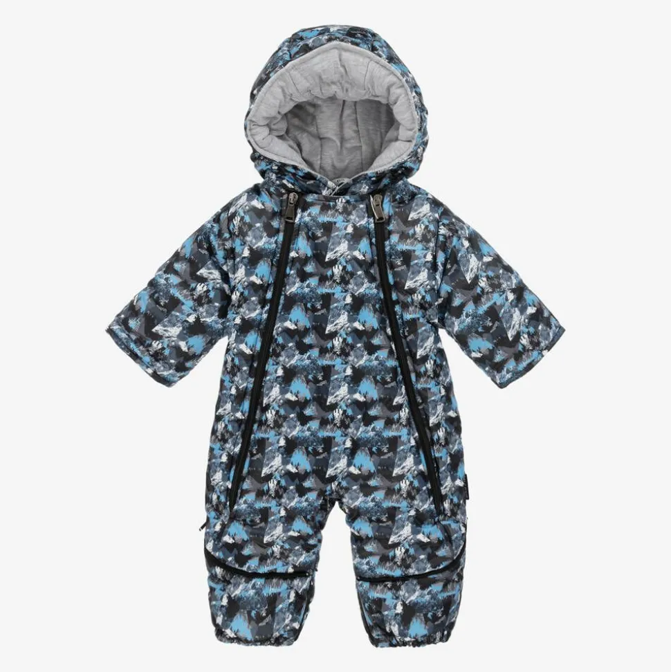 A blue and white snowsuit for baby boys by Pilguni, patterned with an abstract alpine mountain print. Ideal for colder temperatures, this practical snowsuit is warmly padded with Isosoft insulation and lined with comfortable cotton jersey. It has built-in mittens and booties that easily fold over and it also converts into a cosy snow bag by adjusting the zips at the bottom. Soft and silky, it has stretchy ribbed cuffs and double zip fastenings on the front and between the legs for easier dressing. The protective hood is gently elasticated to help keep it in place.
