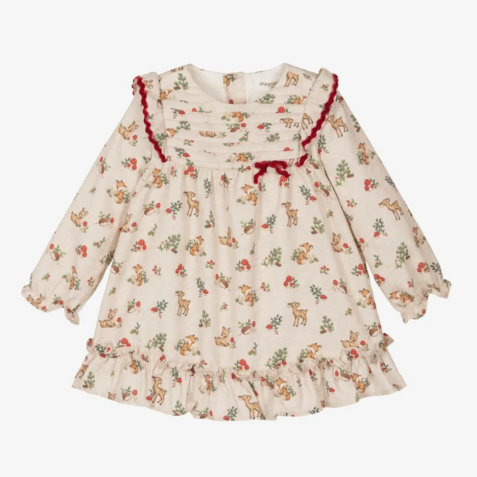 Sweet beige cotton dress for baby girls by Spanish brand Mayoral. Patterned with a charming woodland animal print, this puffed sleeved dress has smart pintuck pleats on the bodice with red velvet ruffles and a little bow. It is lined in soft cotton for comfort against little one's delicate skin and fastens with buttons on the back.