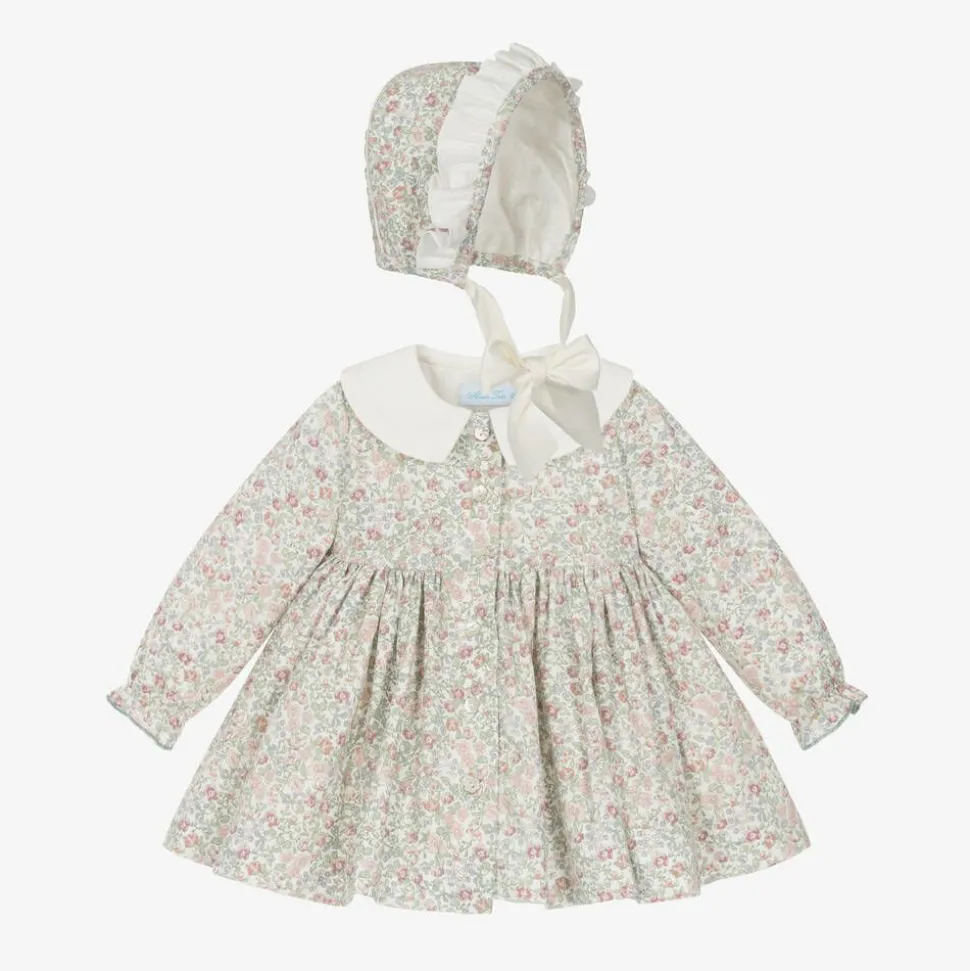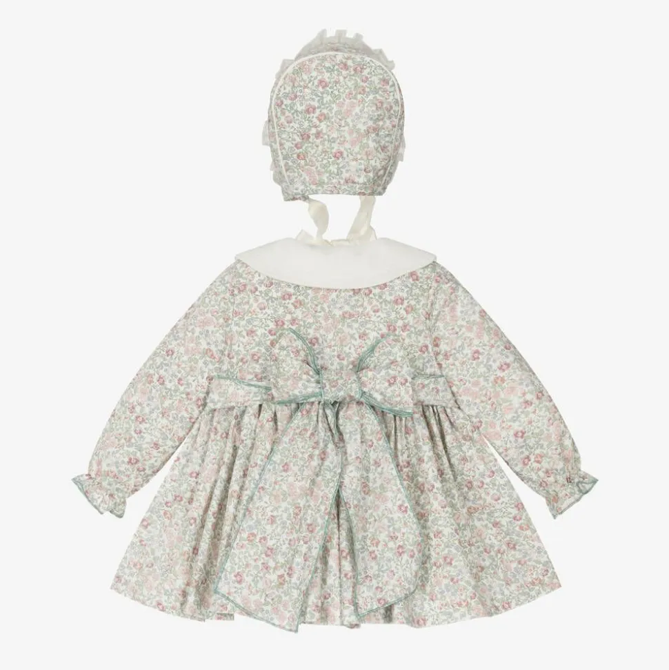 Ivory dress set for baby girls by Spanish brand Abuela Tata, beautifully patterned with small pink and blue flowers and muted green leaves. Made in soft cotton twill, the long-sleeved dress has an oversized, contrast collar with seam detailing. There are flower-shaped, pearlescent buttons on the front and a lovely bow sash on the back. The dress has a cotton-mix lining for a fuller shape and comes with a pair of plain ivory knickers to cover a nappy. To complete the outfit, a traditionally styled bonnet fastens under the chin with satin ribbon ties.