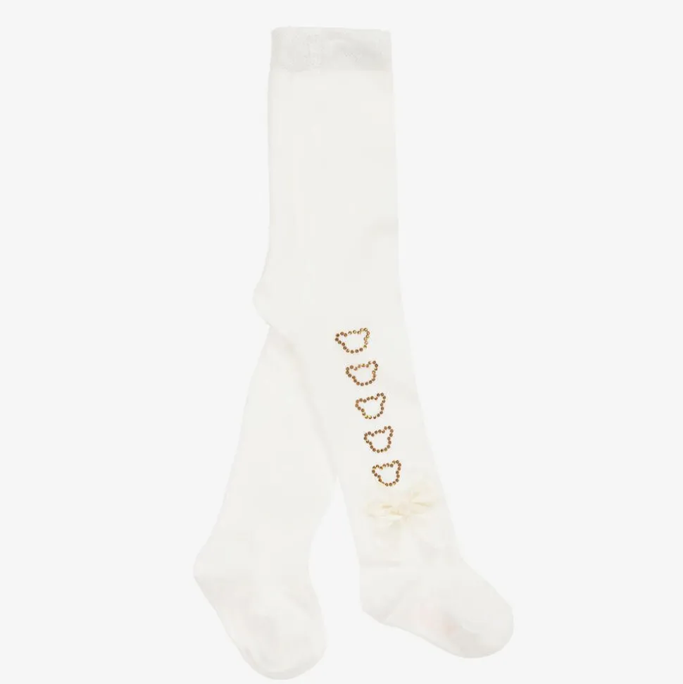 Delightful ivory tights for baby girls from Little A by A Dee, made from a soft knit. They have gold diamanté teddy bear motifs and silky ribbon appliqué bows for a sweet look. The elasticated waist ensures a comfortable fit and there are pale pink jacquard logos on the soles of the feet for subtle branding.