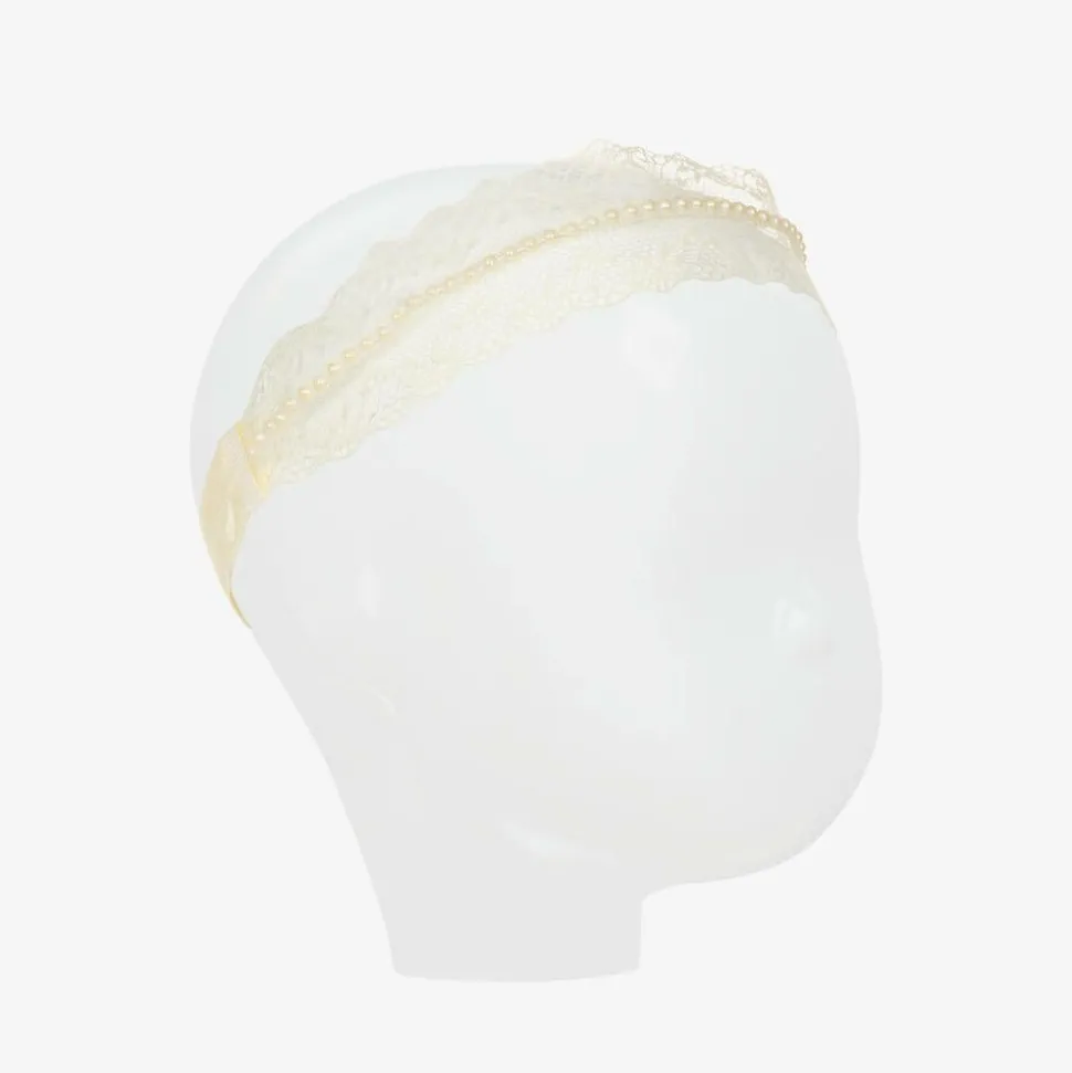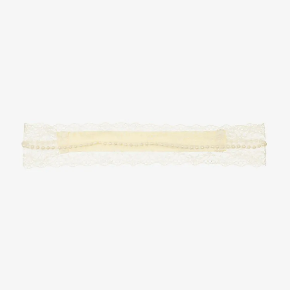 Gorgeously elegant, this ivory headband for baby girls is by British brand Cute Cute. Beautifully handmade from lightweight lace, it is embellished with a row of faux pearls for a delicate finish. There is an elasticated panel on the back to ensure comfortable wear.