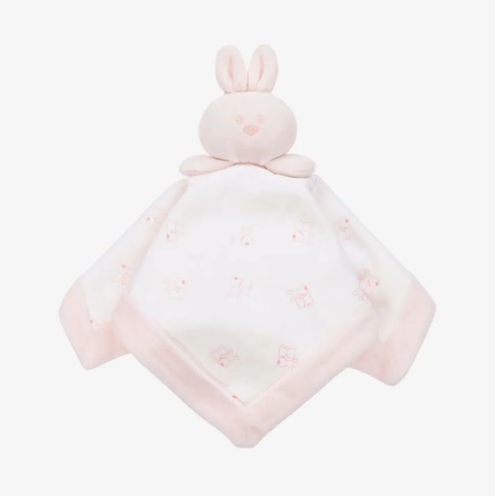 An adorable pink and white doudou for baby girls by Emile et Rose. It has a cute bunny soft toy in the middle, ideal for little hands to hold and a soft cotton jersey panel patterned with teddy bear and bunny motifs. The pink velour trim and lining add softness and a cosy feel to this sweet comforter.