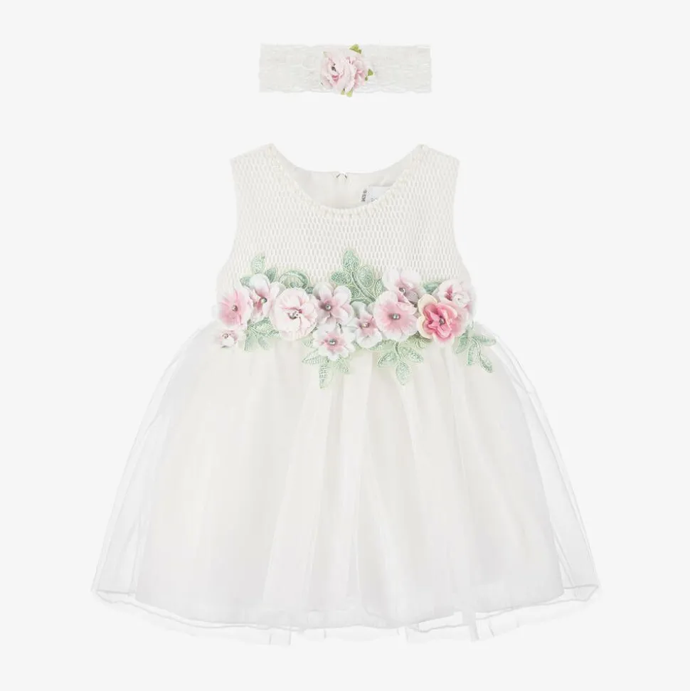 Baby girls white dress and headband set from Beau KiD. The bodice is made in pretty soft mesh with pearl trim on the neck. The skirt has gathered layers of voluminous tulle and is decorated with fabric flowers, leaves and diamantés. There is a removable flower and tulle brooch on the back and a matching stretchy lace headband.