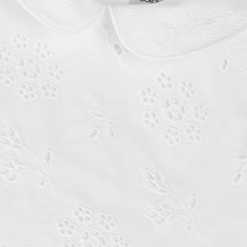 A white cotton dress for baby girls by Italian fashion house Dolce & Gabbana, made and lined in beautifully lightweight poplin. A delicate look from the luxury brand, this sleeveless dress is decorated with dainty broderie anglaise florals. The waffle-weave collar is signed with tone-on-tone logo embroidery and the back secures with a neat, concealed zip. It is presented with a pair of matching cotton knickers.