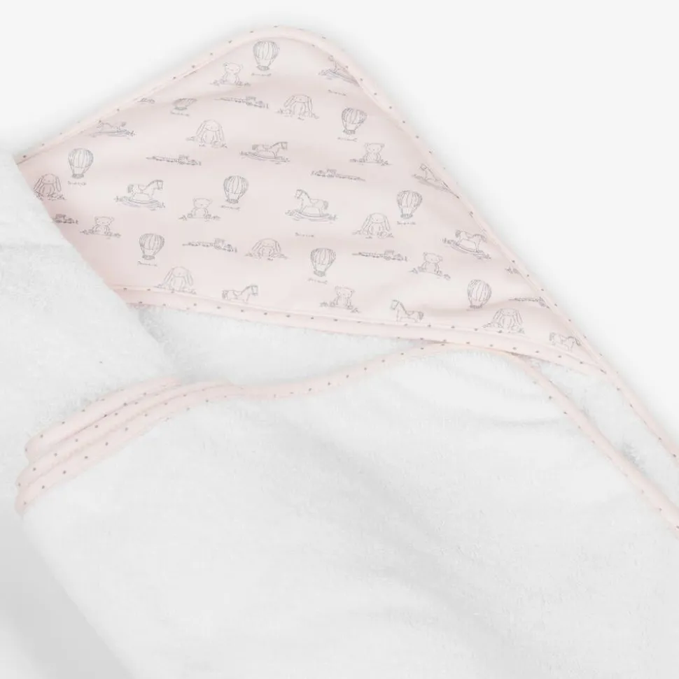 Lovely white hooded towel for baby girls by Babidu. Made in soft cotton towelling, it is ideal for keeping little one warm and dry after bath time. The sides and hood are trimmed in pink cotton jersey and printed with a cute pink nursery print.