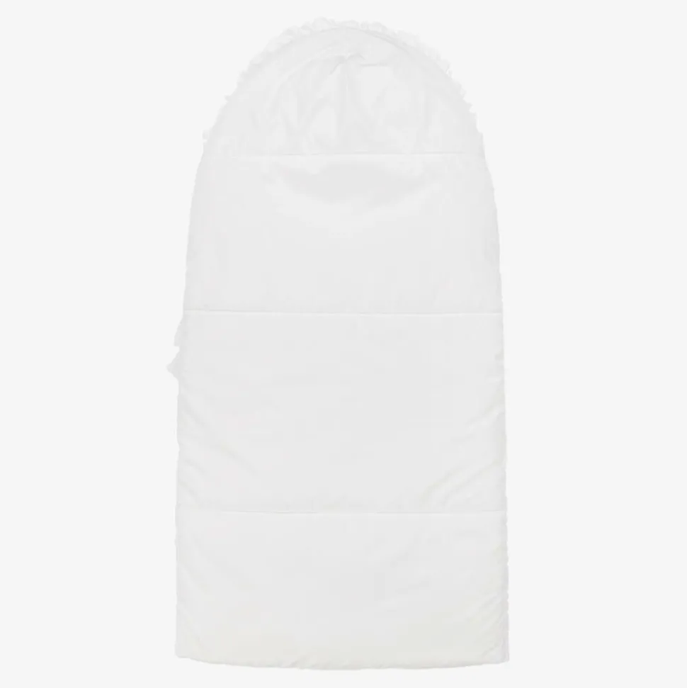 White silky satin nest for baby girls by Lapin House, with a beautiful pale pink and blue print of flowers, birds and bunnies. In a wrap-around style with frilly satin trims, it is warmly padded and lined in soft, comfortable cotton jersey. The nest has popper-fastening straps on one side, with pretty fixed bows on top.