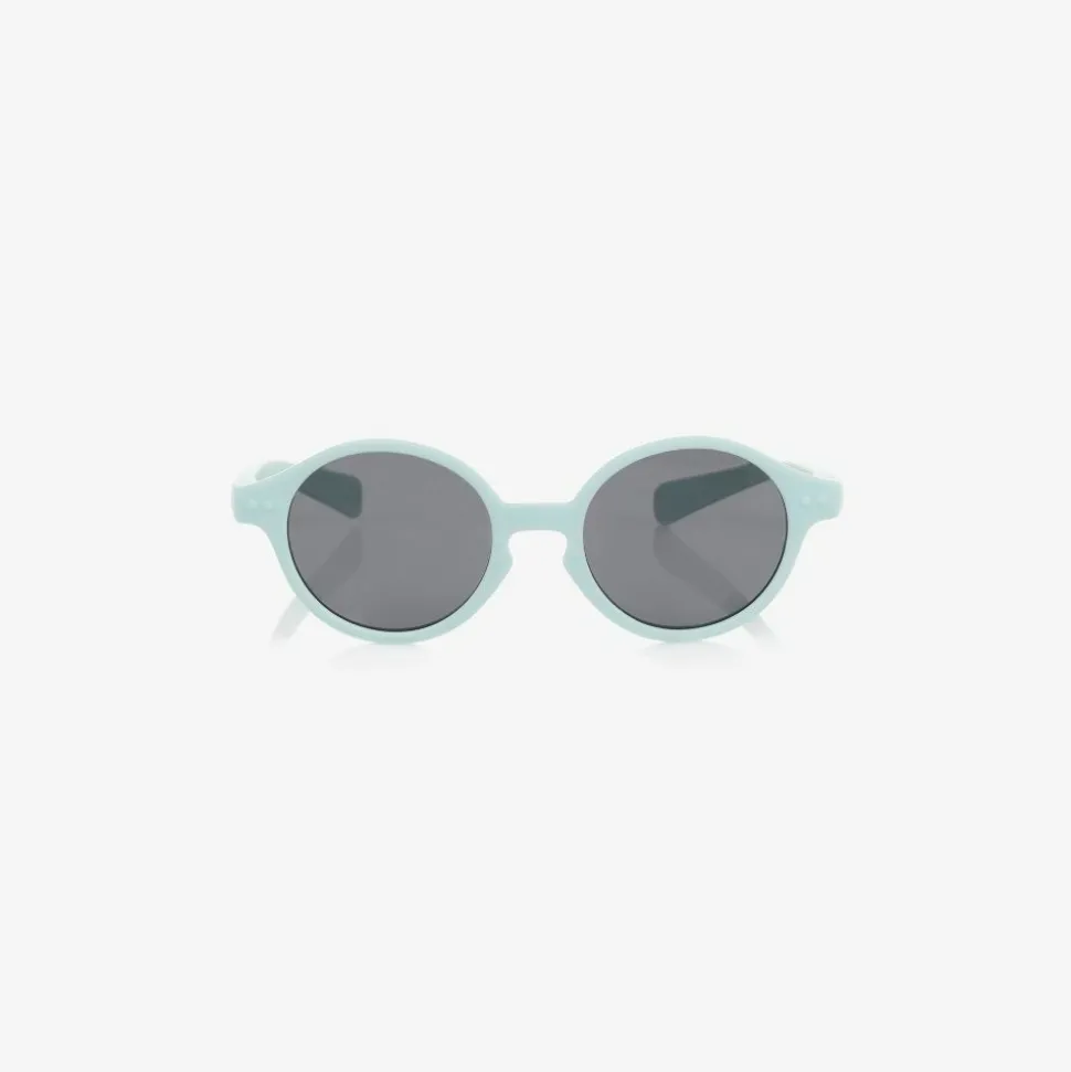 Pale blue sunglasses for baby boys and girls, by IZIPIZI. With matte blue plastic frames, they have a blue silicone strap to help keep them in place, and polarised lenses to protect your baby's eyes.