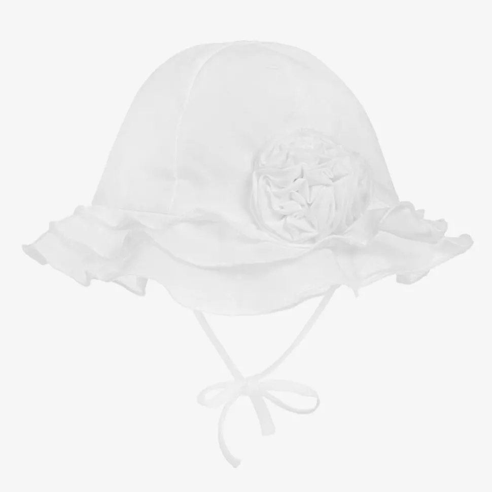 A pretty lightweight polycotton, white sun hat for baby girls, by Sarah Louise. It has a fluted layered brim and a gorgeous fabric flower on one side. It comes with detachable chin ties.