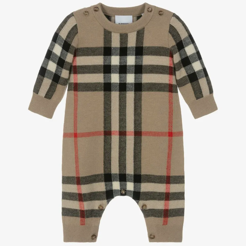 Archive beige romper for baby boys and girls by luxury British brand Burberry, featuring the iconic oversized check. This designer babygrow is knitted in the finest wool and cashmere blend, with a ribbed crew neck and trims. It has button fastenings on each shoulder and between the legs.