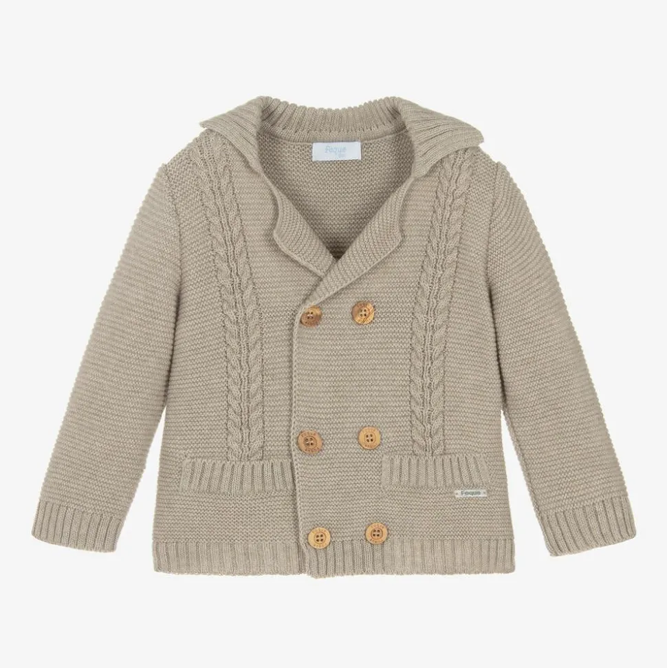 A beige cardigan for little boys and girls by Spanish brand Foque, finely knitted in a cotton and wool blend. This classic layering piece is styled with cable knit detailing and ribbed trims. The double-breasted front fastens with branded wooden buttons.