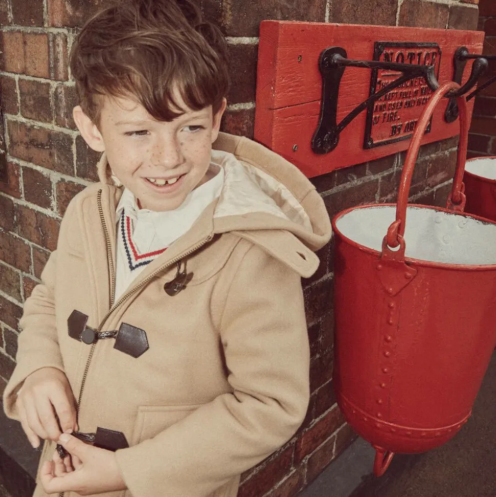 Hooded beige duffle coat for boys and girls by traditional British brand Beatrice & George, exclusive to Childrensalon. Lightly padded, it is made in a beautifully soft and cosy, felted wool blend. There are useful flap pockets on the front, one with a smart, embroidered monogram logo. It has faux bone toggle fastenings, with brown eco-leather loops, and a zip below. It is lined with ivory logo jacquard satin for comfort.
