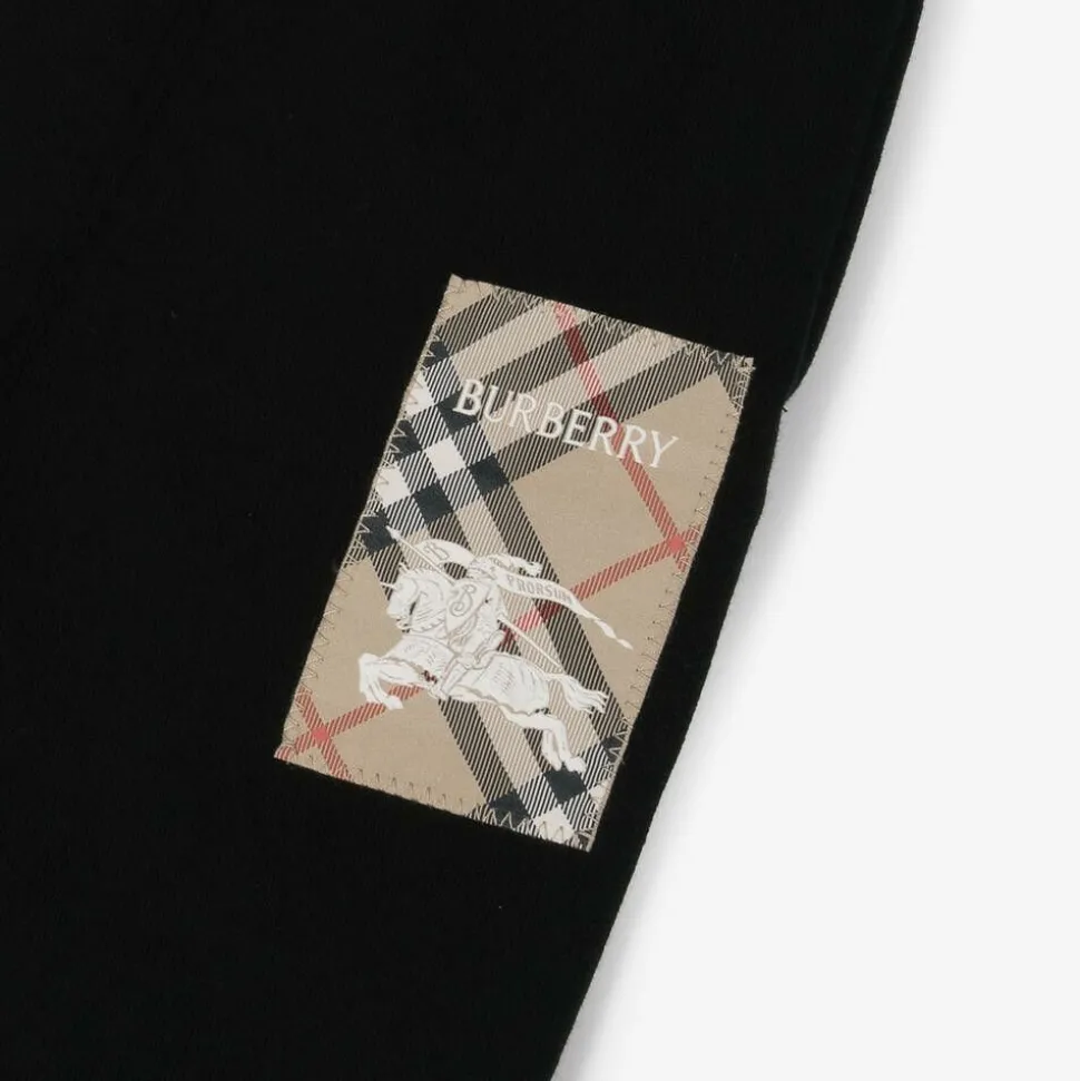 Black cotton joggers for baby boys and girls by luxury British brand Burberry, made in comfortable, mid-weight jersey. They have a stretchy ribbed waistband, side seam pockets and a silky, Equestrian Knight Design label for instant branded appeal.