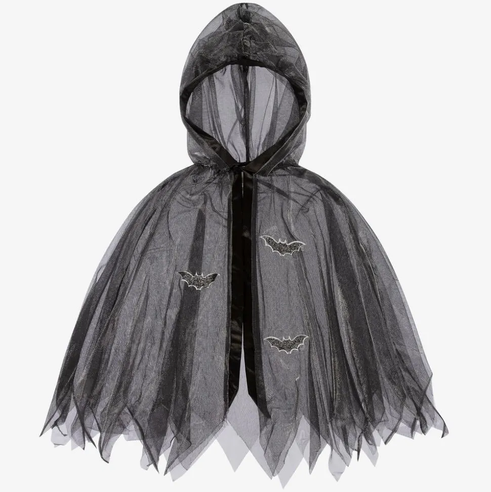 Lovely black and shimmery silver dressing-up cape for boys and girls by Souza, with glittery silver bats. Hooded and trimmed in black satin, it has a single button to secure under the neck. Fun for little witches and wizards to wear whilst trick-or-treating.