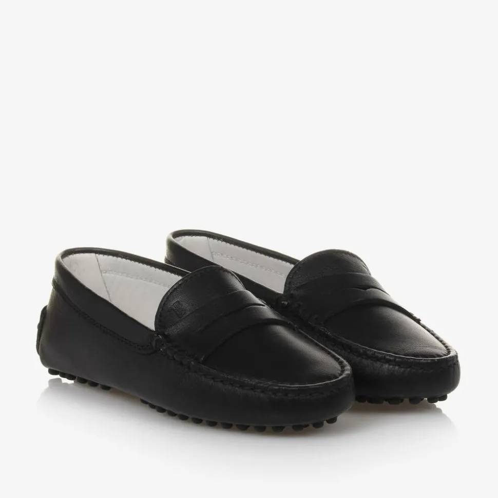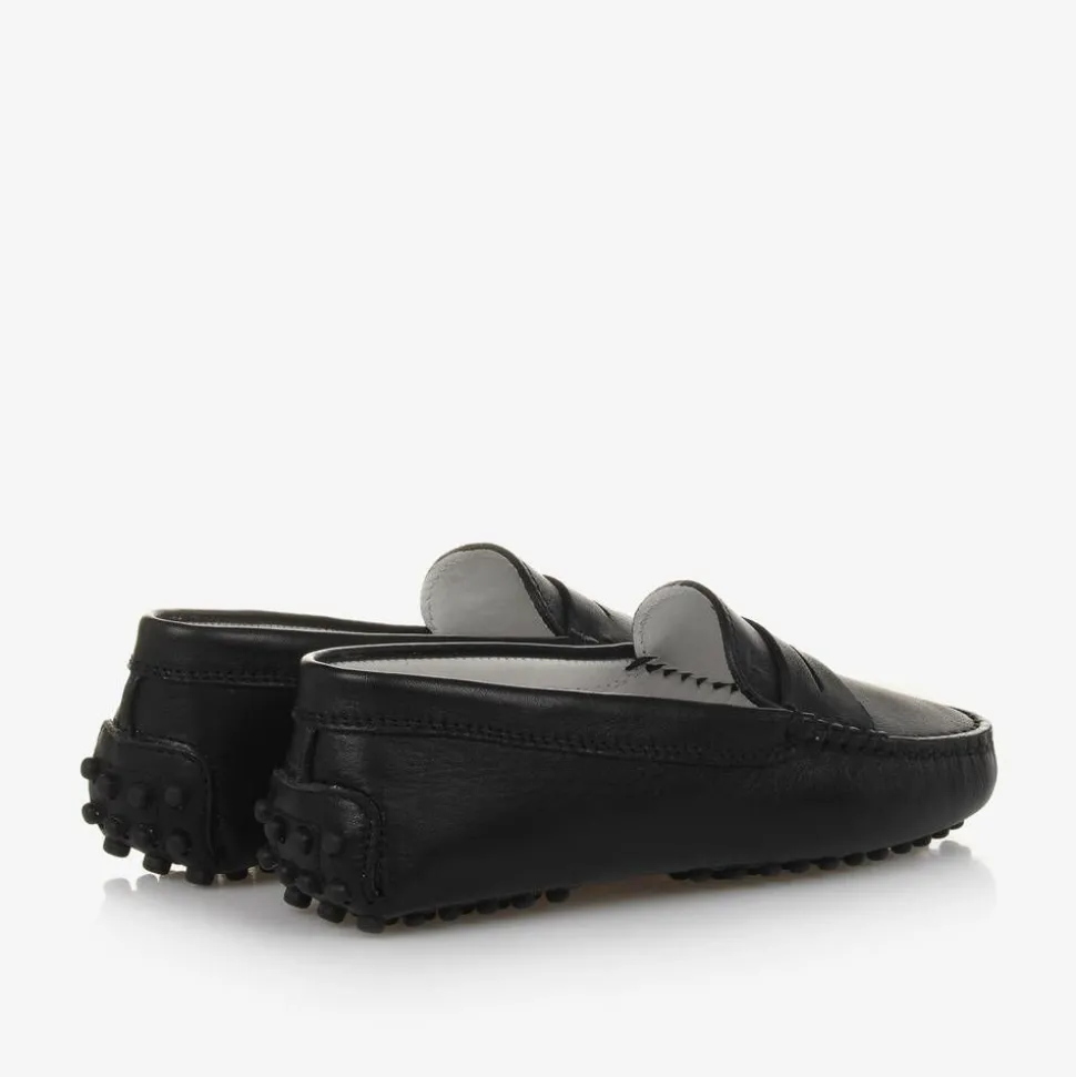 Black Gommino moccasins for boys and girls by luxury Italian brand Tod's. Beautifully handmade in smooth leather, these smart slip on shoes are classically styled with stitched detailing on the toes and a subtle embossed monogram logo on the front. They are lined in smooth leather with leather outer soles detailed with the designer's signature rubberised pebble grips.