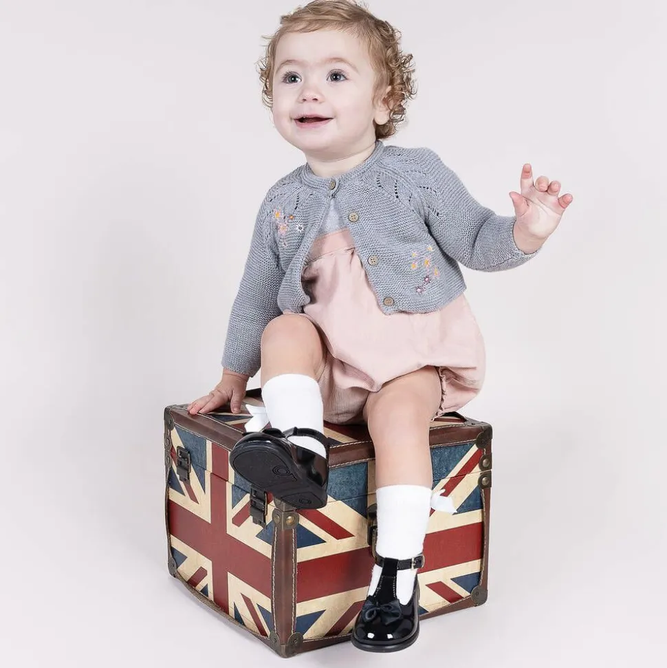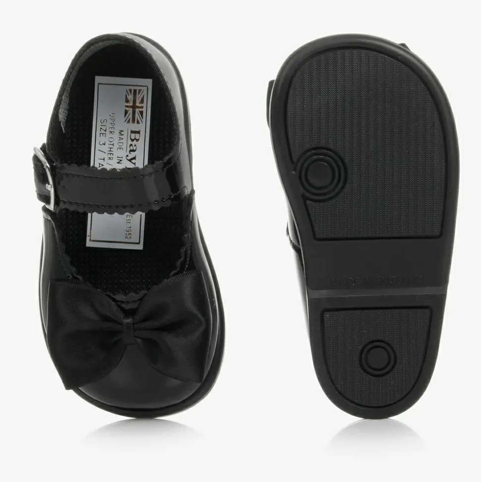 Girls smart, black patent shoes with satin bows, by Early Days. Made in soft faux patent leather, they have a lightly padded fabric lining. There are black non-slip rubber soles and they fasten with an adjustable buckle. They come with pretty scalloped edges.